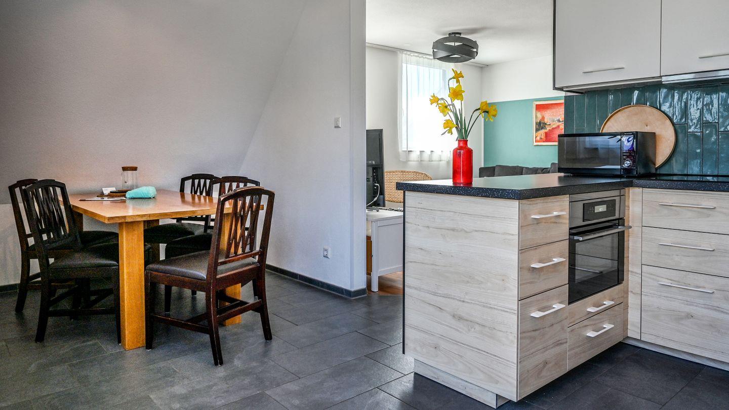 Die modern eingerichtete Ferienwohnung für bis zu 8 Personen liegt im 1. OG und DG. Es gibt ein abgeschlossenes Schlafzimmer mit 180er Bett im OG, ein Schlafzimmer mit Doppelbett sowie ein weiteres mit