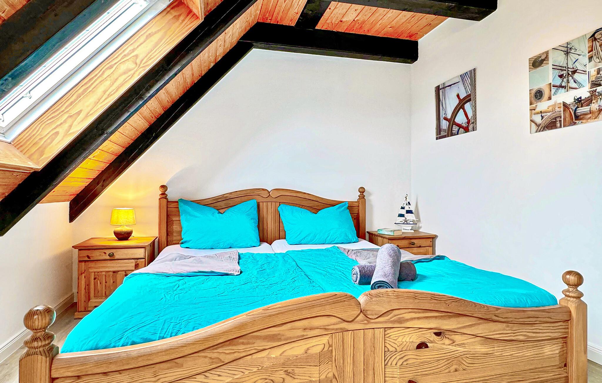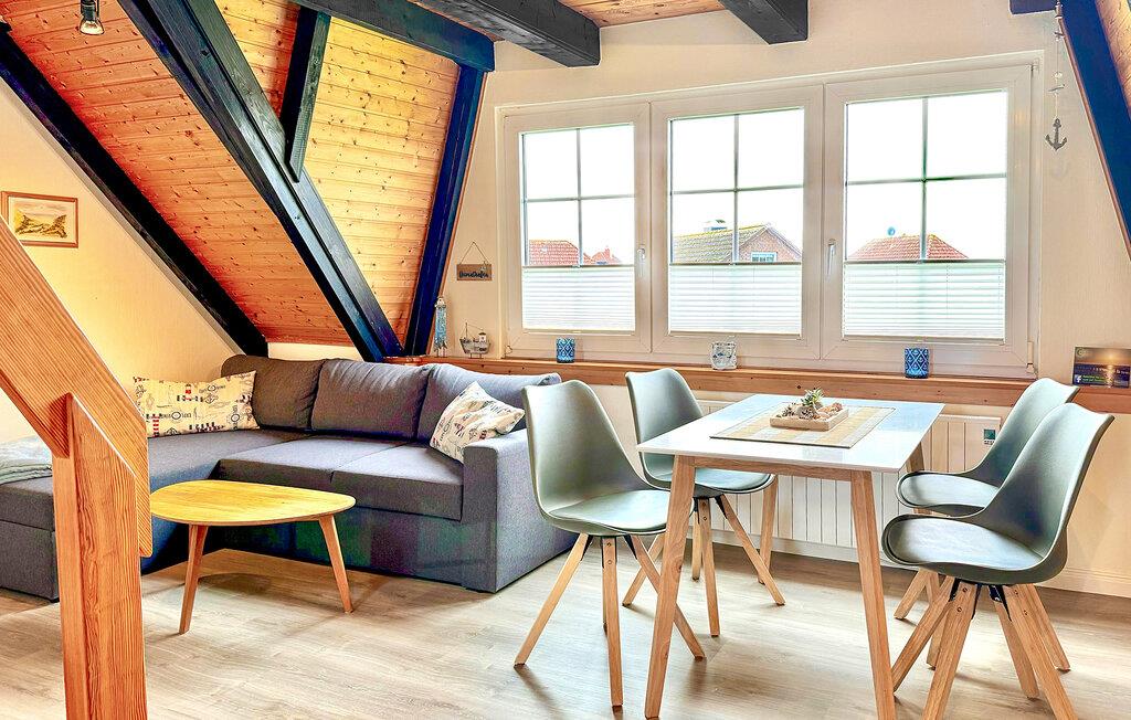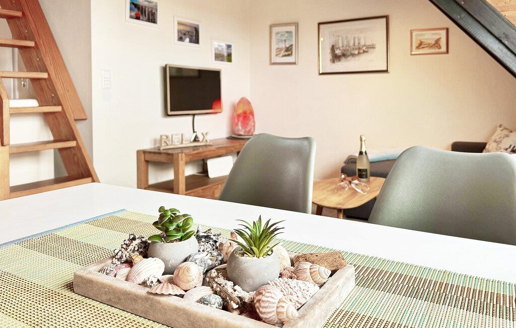 Lejligheden strækker sig over to etager og er indrettet med smukke møbler og masser af træelementer. I den hyggelige stue kan I slappe af efter en dejlig dag ved havet med en spændende film eller bare gøre jer komfortable i sofaen. Der er også spiseplads og åbent køkken samt badeværelse og et af soveværelserne med dobbeltseng. En trappe fører jer til yderligere to sovepladser.