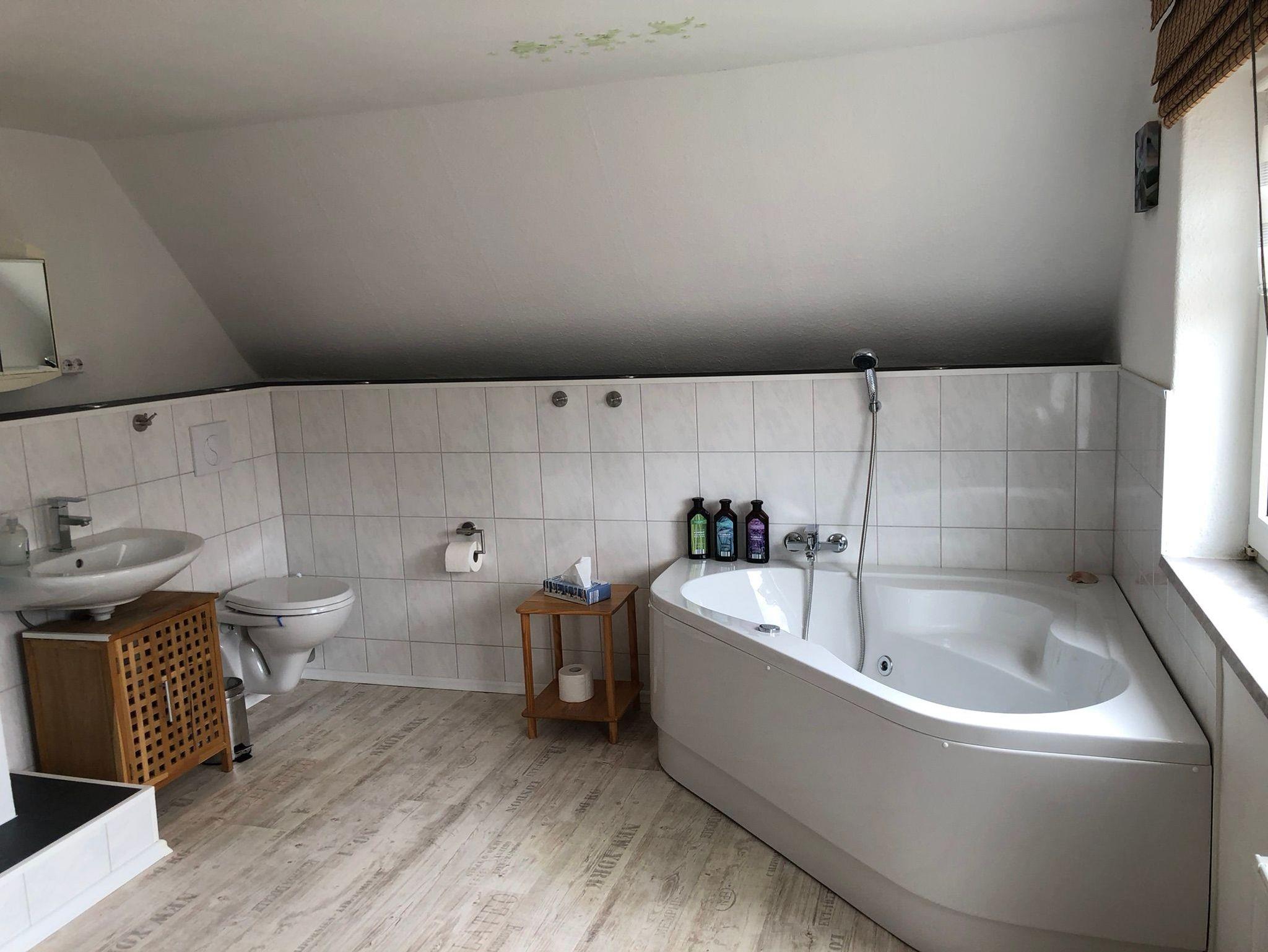 Ein großes zweites Badezimmer lädt in der Whirlpoolwanne zur Entspannung ein. Das Bad hat zwei Tageslichtfenster, WC und Waschbecken. Die Deckenleuchte kann mit einer wechselnden Farbscala geschaltet werden.