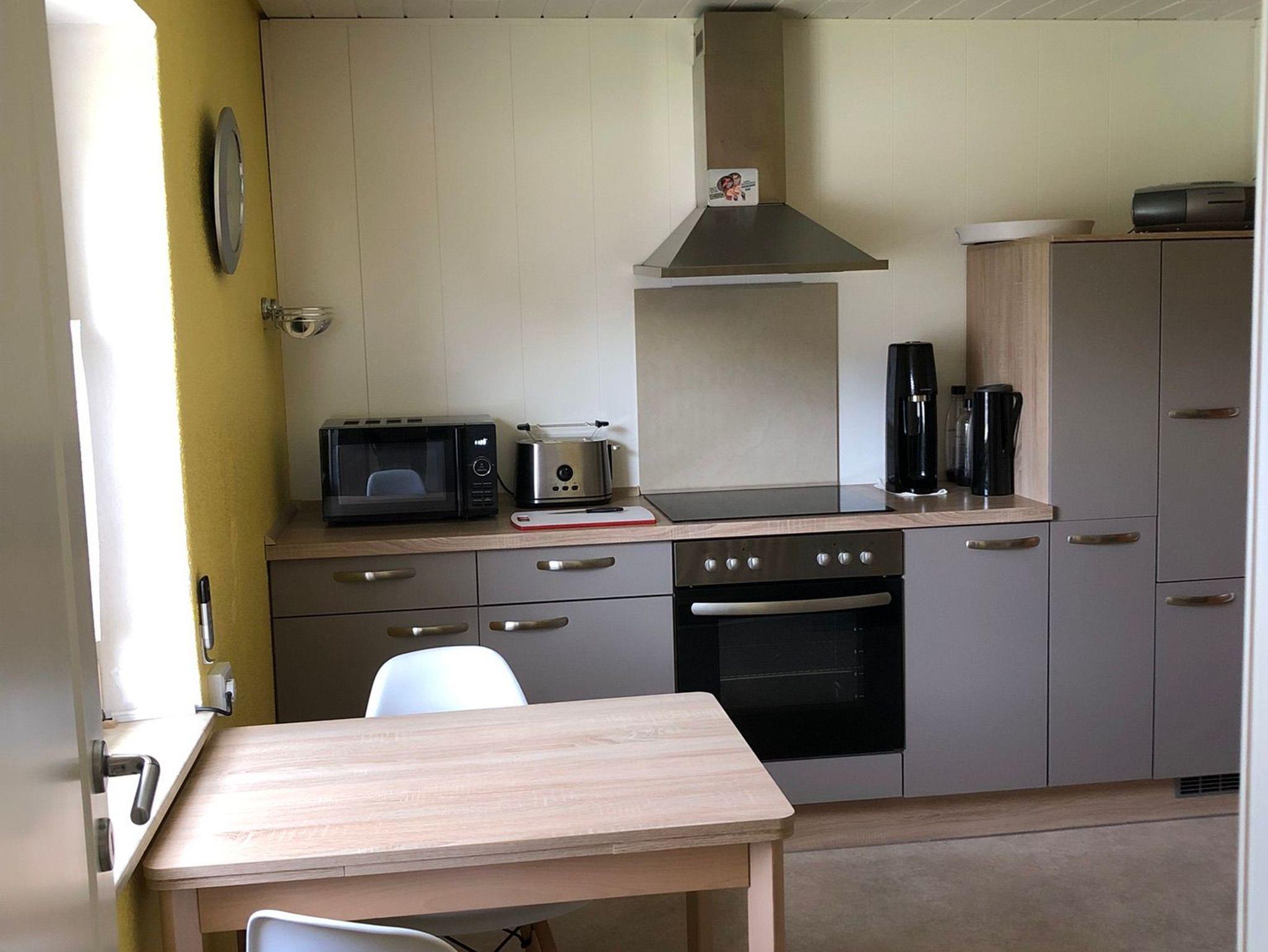 Die separate, geräumige Küche ist mit einer modernen Einbauküche eingerichtet. Sie ist komplett ausgestattet mit Kaffeemaschine, Wasserkocher, Eierkocher, Mikrowelle, Toaster, reichlich Geschirr, Besteck, Töpfen und Pfannen. Moderne E-Geräte wie Geschirrspüler, Backofen, Cerankochfeld und Kühlschrank mit 3-Sterne-Gefrierfach sind selbstverständlich. Ein ausziehbarer Esstisch lädt zum Frühstücken direkt am Fenster ein.