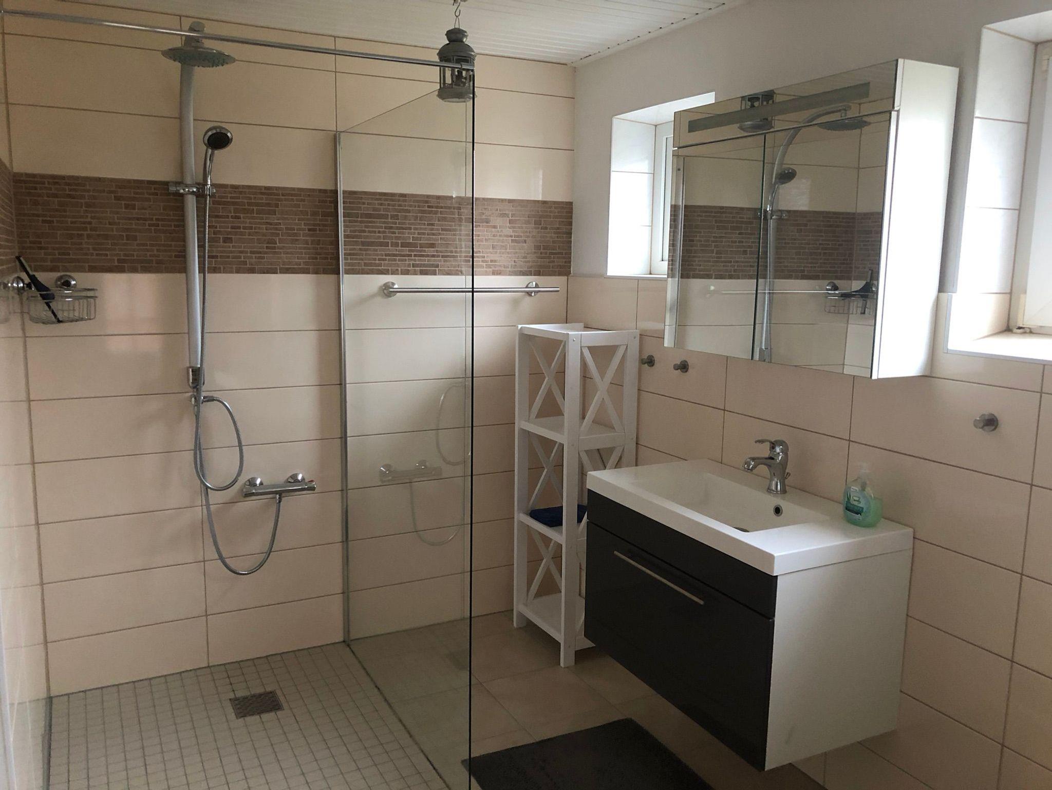 Das moderne und sehr geräumige Badezimmer im Erdgeschoss ist mit einer großen Walk-In-Dusche, einem hübschen Waschtisch, WC und neuer Waschmaschine ausgestattet. Das Bad hat zwei Fenster und eine Außentür zum Garten, sodass man z.B. an Regentagen oder nach einem Tag am Strand ohne schlechtes Gewissen mit nassen oder sandigen Schuhen ins Haus gelangt und sich hier in Ruhe entkleiden kann.