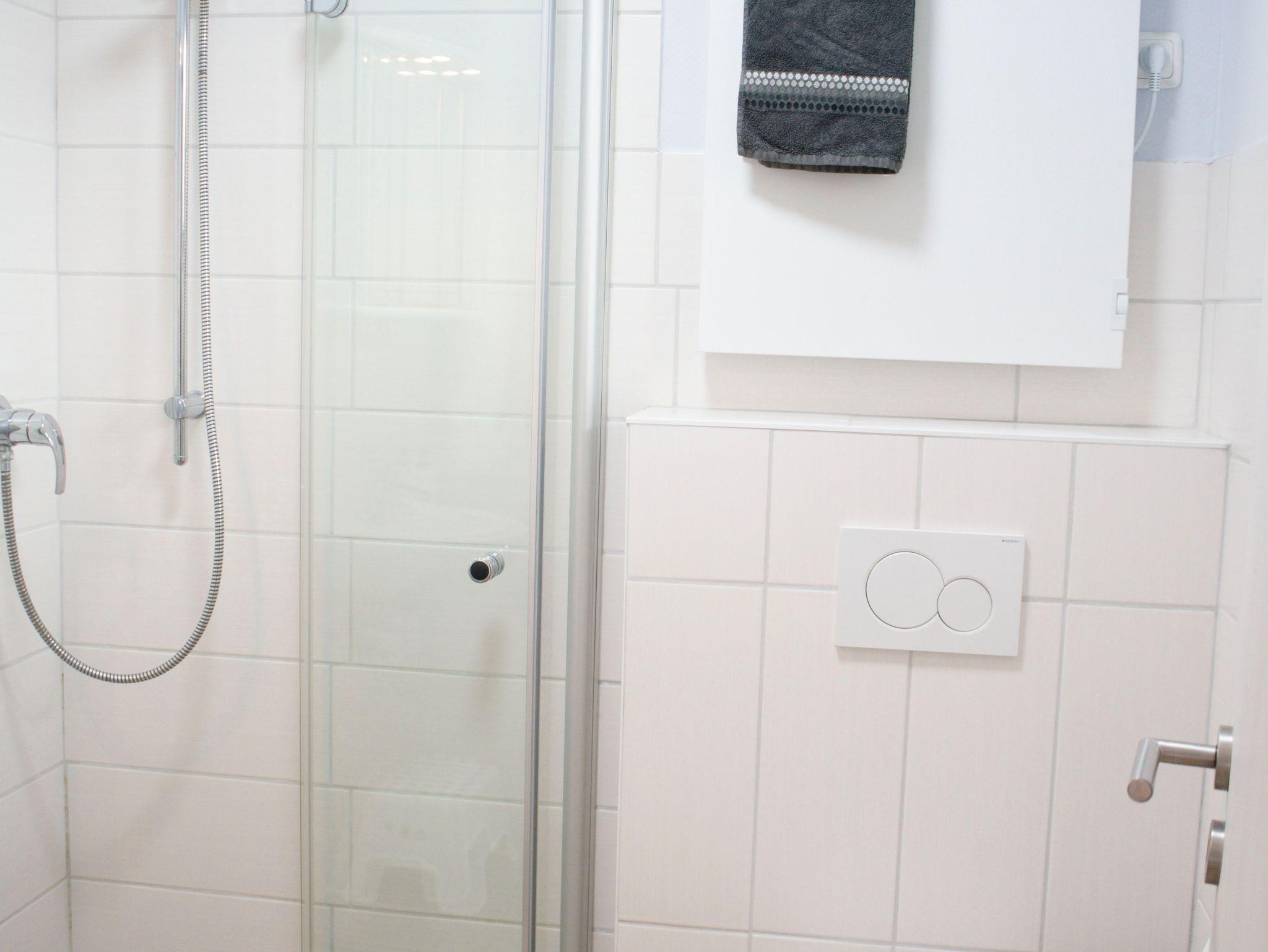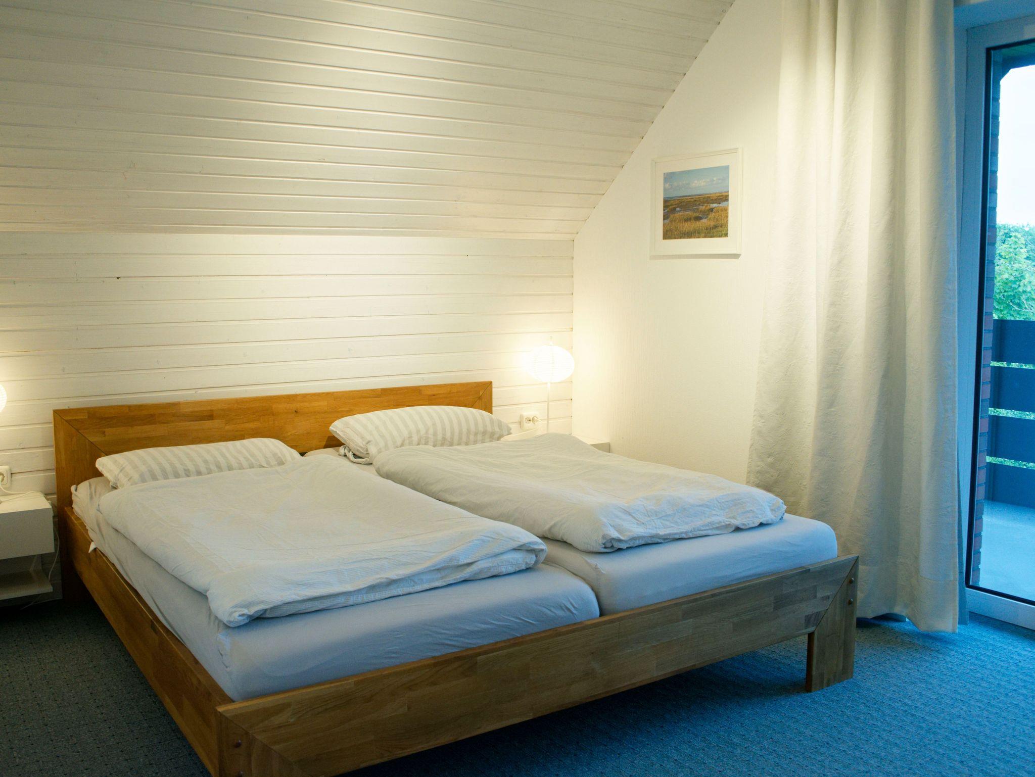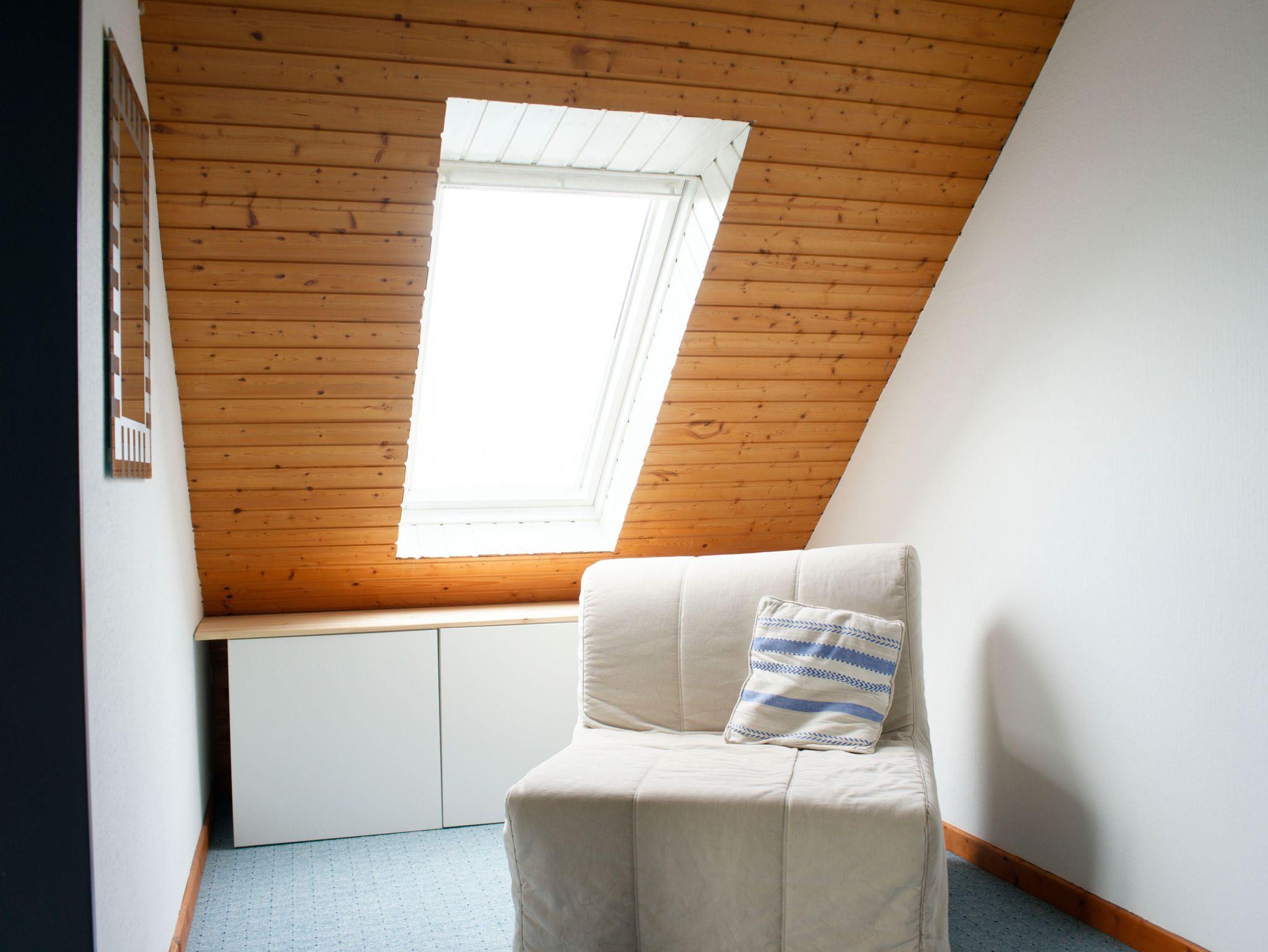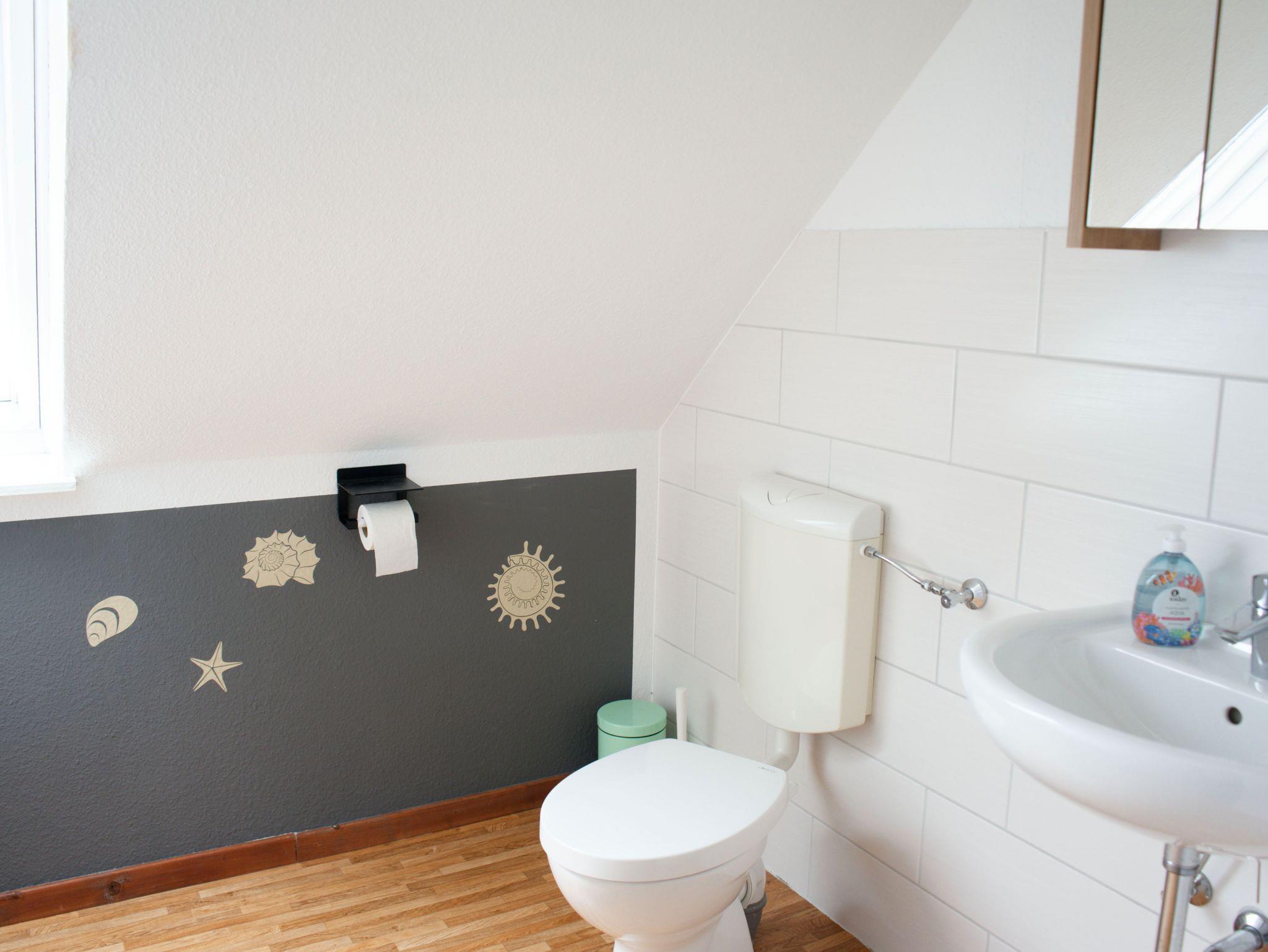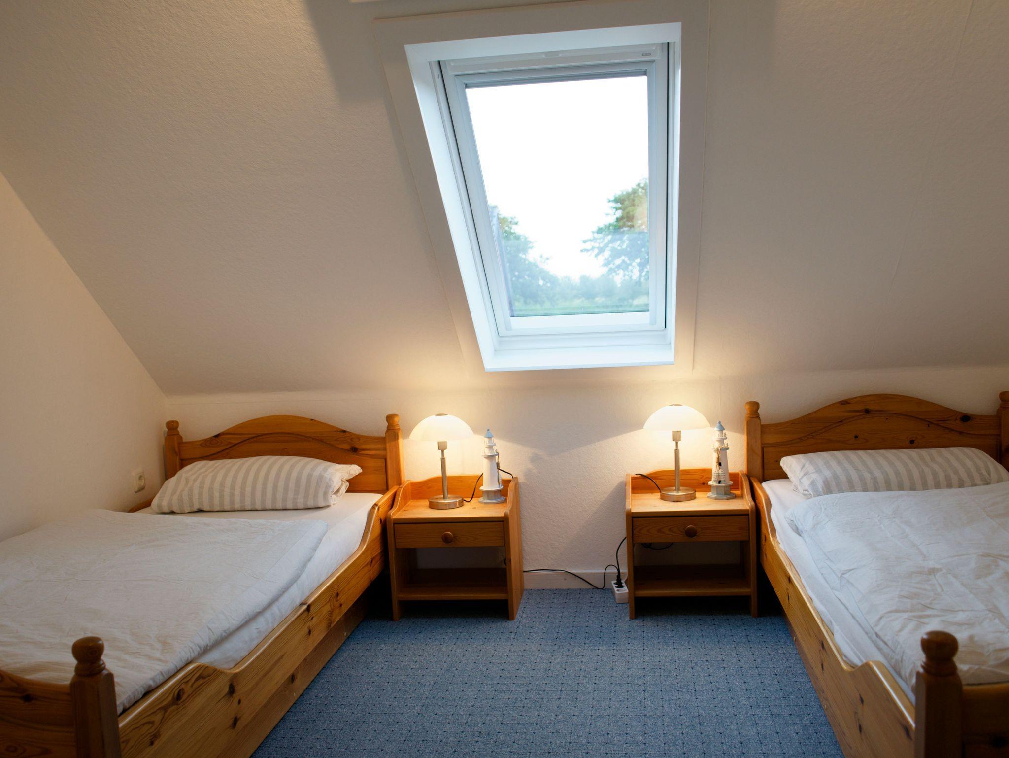 Modernes Badezimmer mit bodengleicher Dusche im Erdgeschoss und zusätzliches WC im Obergeschoss (beide mit Fenster). Zwei Schlafzimmer im Obergeschoss, davon ein Schlafzimmer mit Doppelbett, Schreibtischecke und Loggia. Zustellbett auf Anfrage. Zusätzliche Rückzugsmöglichkeit bietet Sitzecke im Flur des OG.