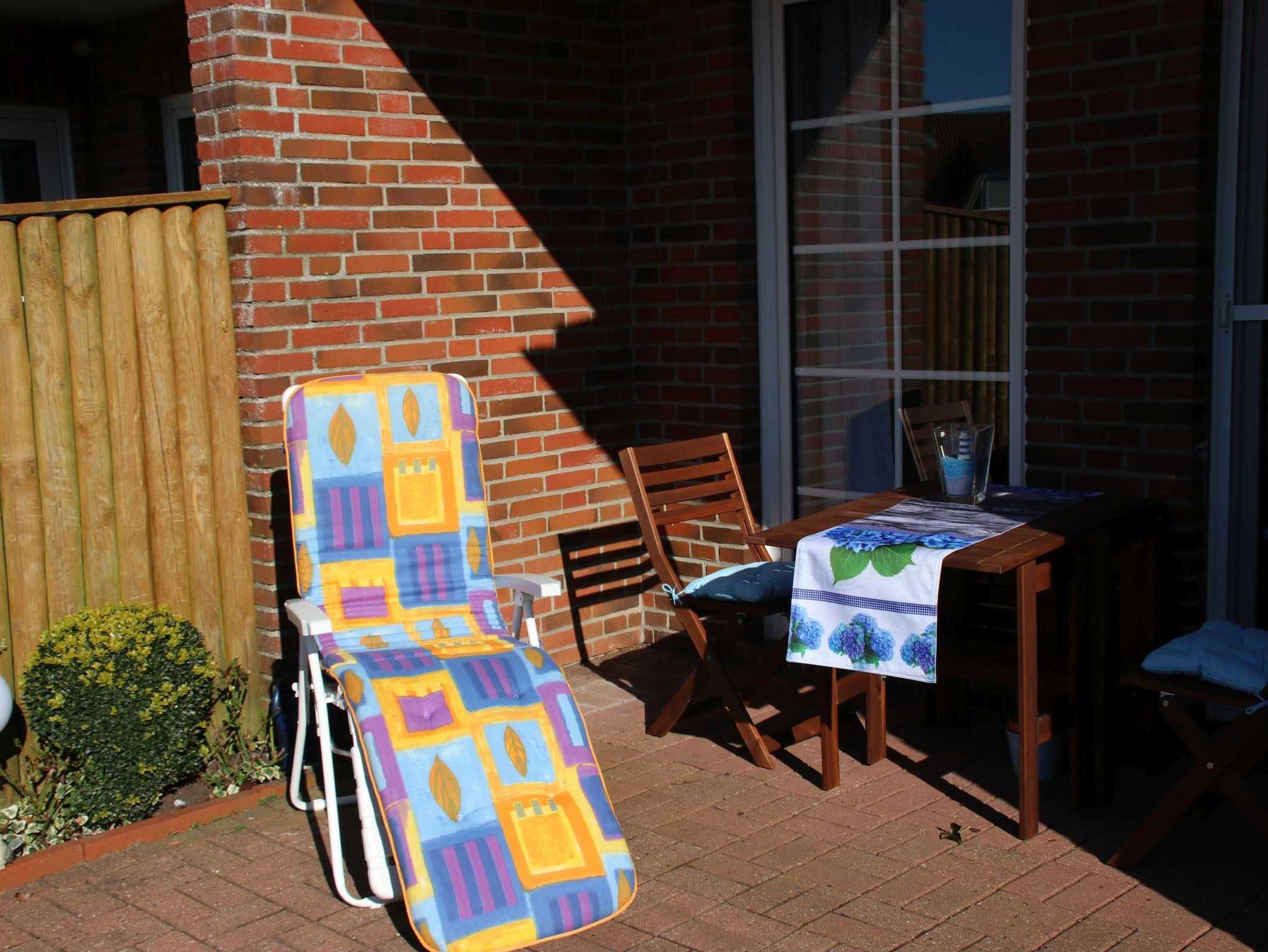• halb überdachte Terrasse mit Balkonmöbeln (Tisch ausklappbar für bis zu 4 Personen, 2 Liegestühle, Sonnenschirm, Elektrogrill/Grill