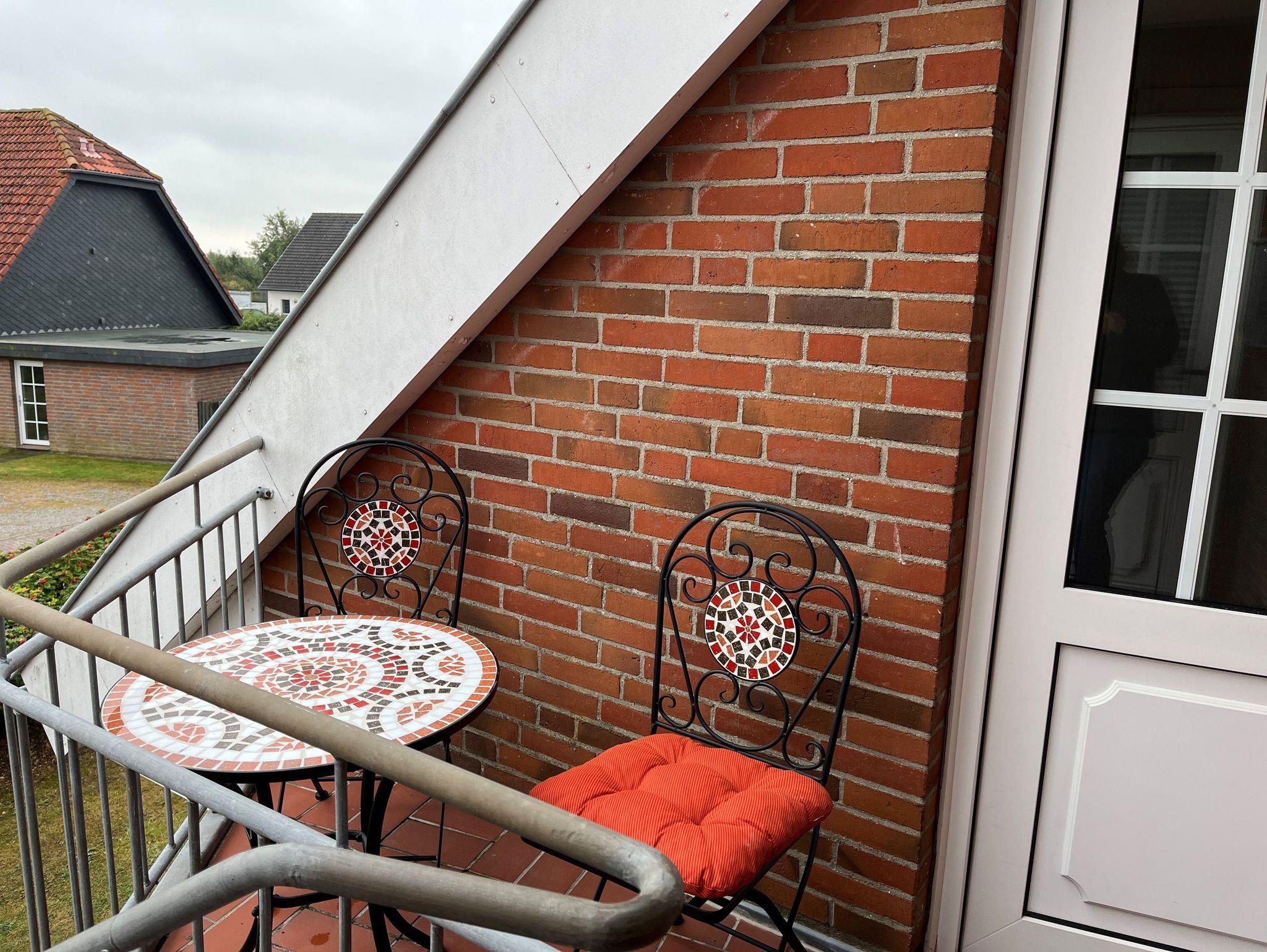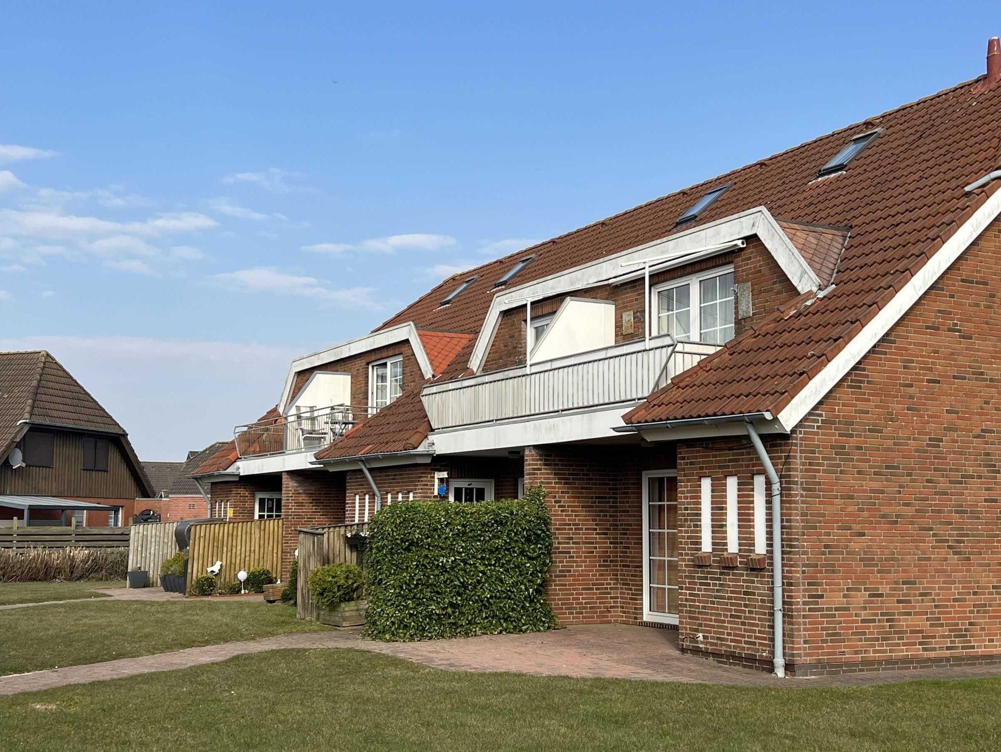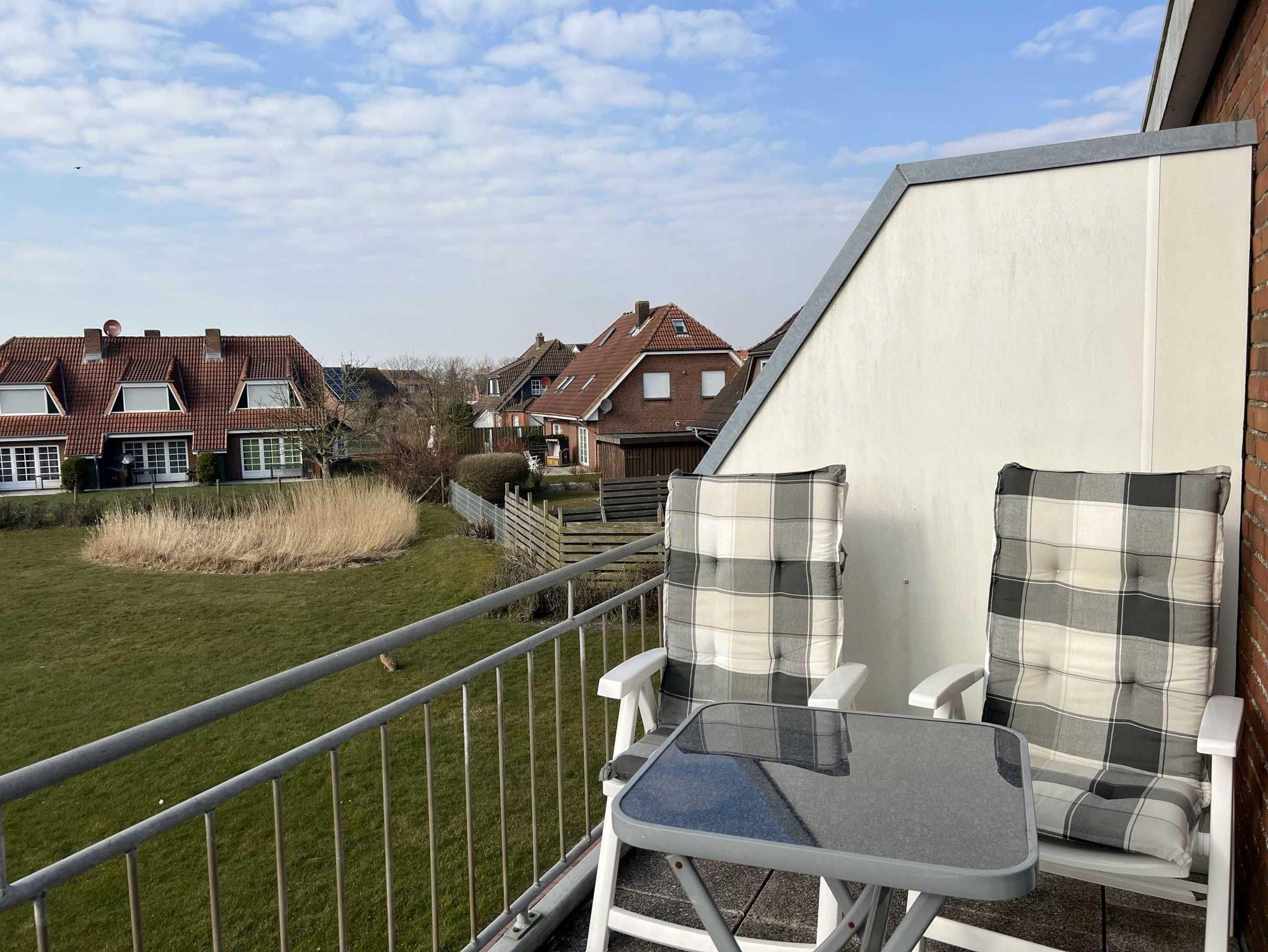Gemütlich eingerichtete 45 qm Ferienwohnung im 1. Stock einer kleinen ruhigen Wohnanlage für bis zu 3 Personen. Balkon mit Blick auf den Deich im Hintergrund.