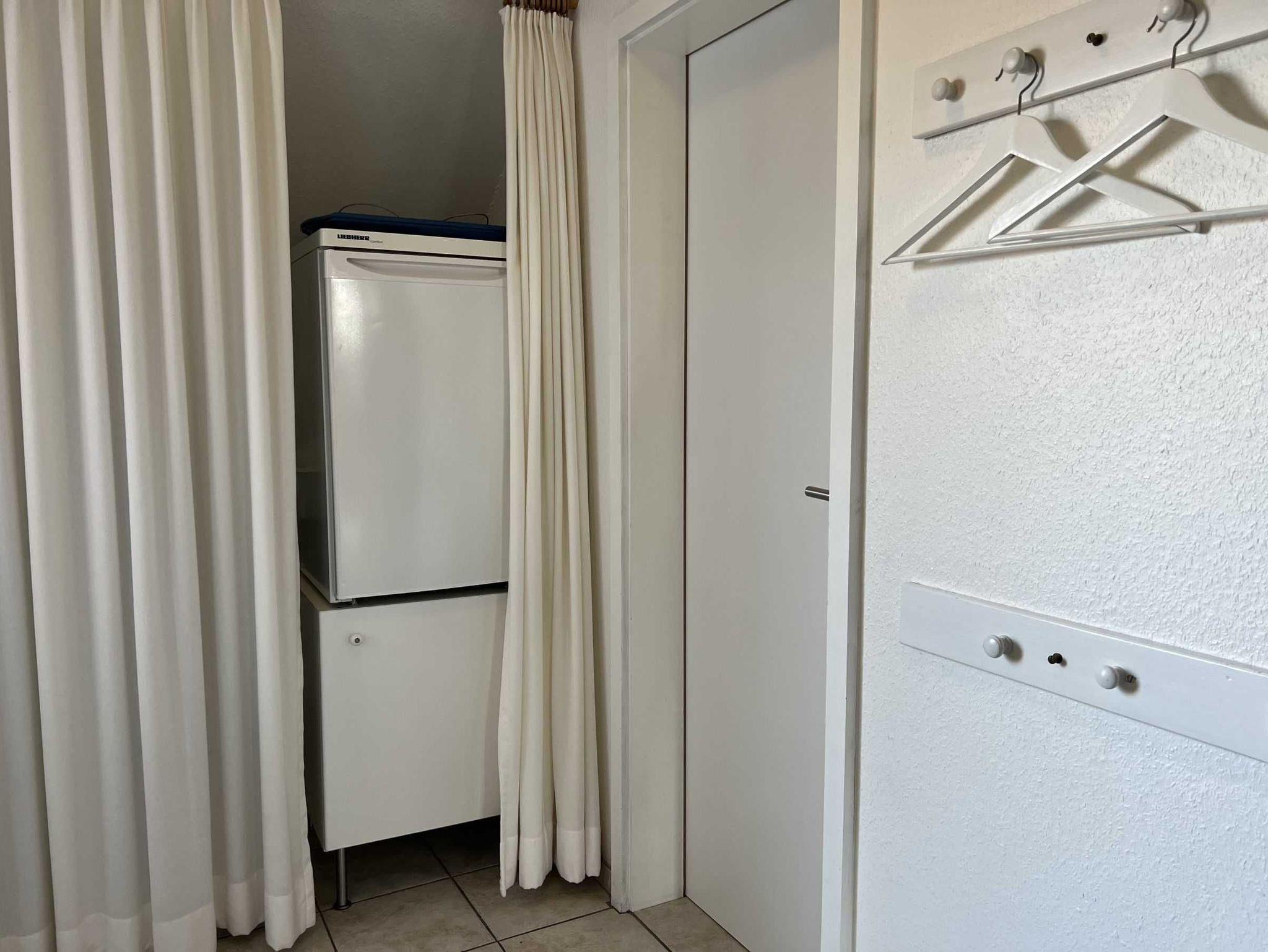 1 Schlafraum mit 2 Einzelbetten sowie ein kombinierter Wohn-/Schlafraum mit Schlafcouch, Küchenzeile mit Geschirrspüler, Mikrowelle, 4-Platten-E.-Herd mit Backofen, Dunstabzug nach außen und Essecke. Dusche/WC, SAT-TV, Kinderhochstuhl und Kinder-Reisebett. Die Wohnung ist komplett mit Fliesen ausgelegt.