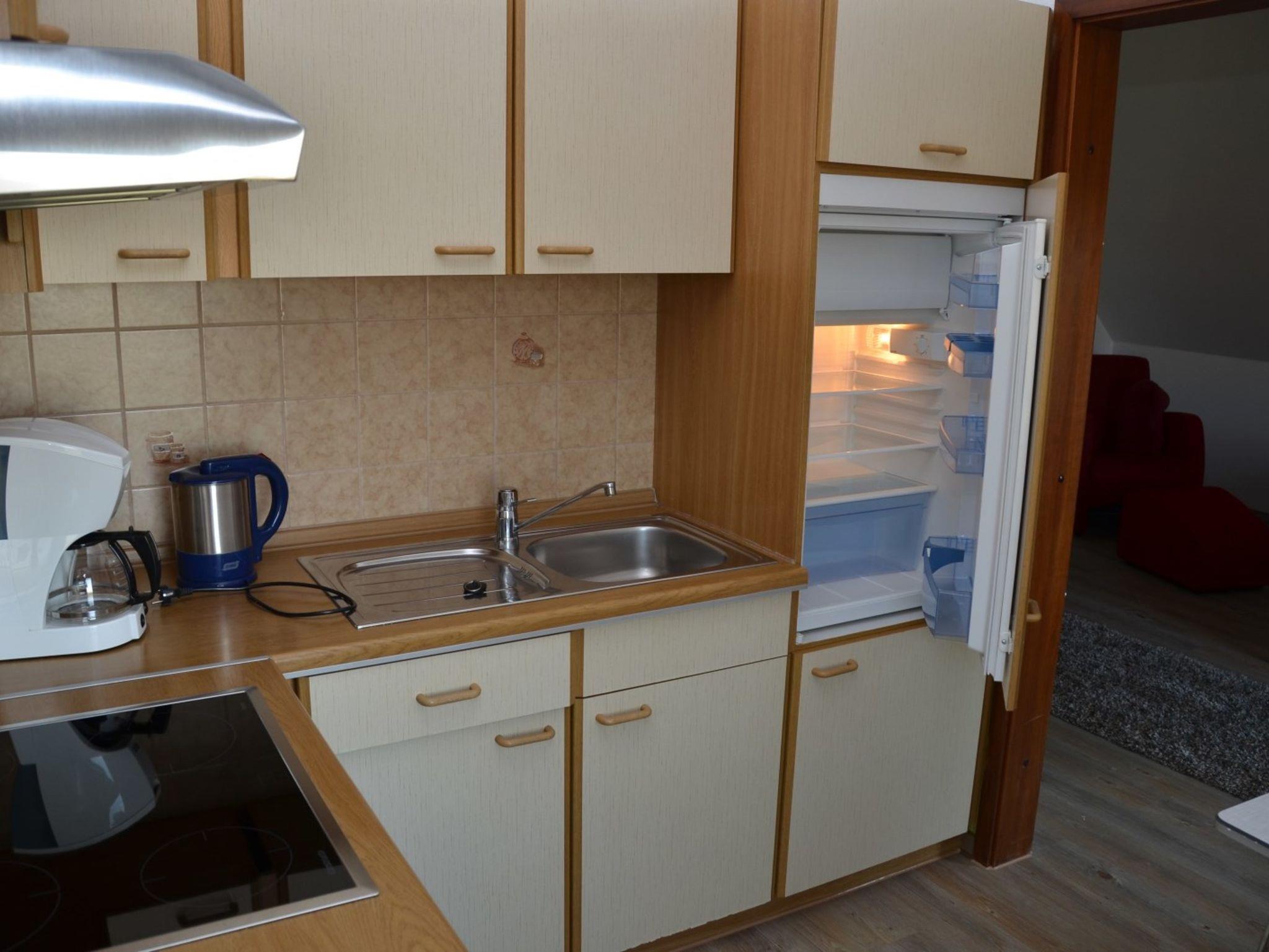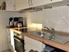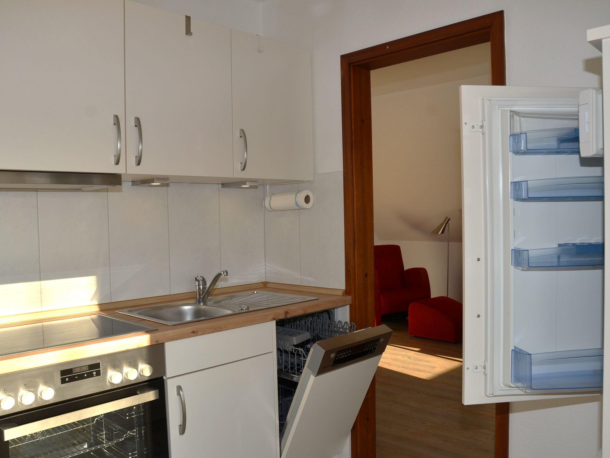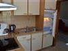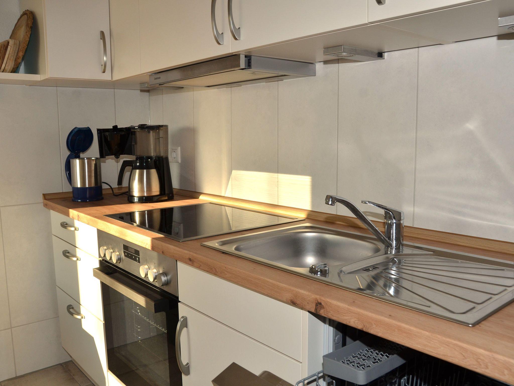 • vollständig eingerichtete Küche (Tür offen zum Wohnraum, durch Vorhang getrennt): Herd mit Cerankochfeld, Backofen und 3-Sterne-Gefrierfach und Geschirrspüler