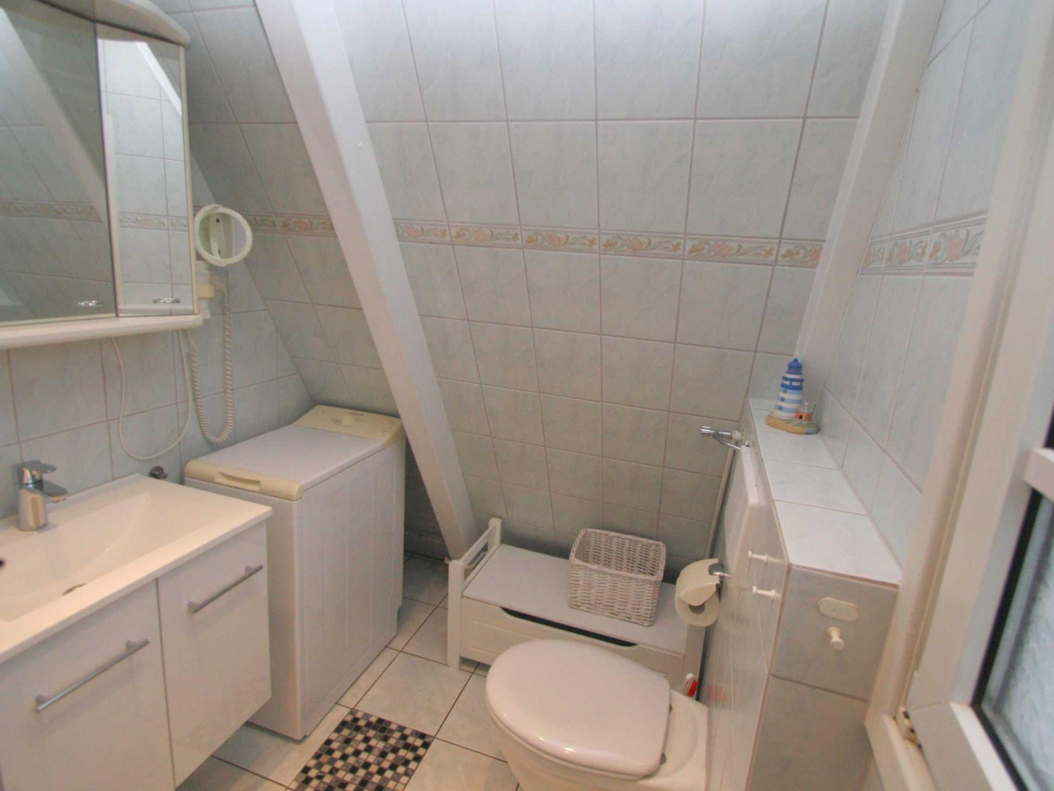 Dusche und WC + festinstallierter Haarfön im Erdgeschoß.