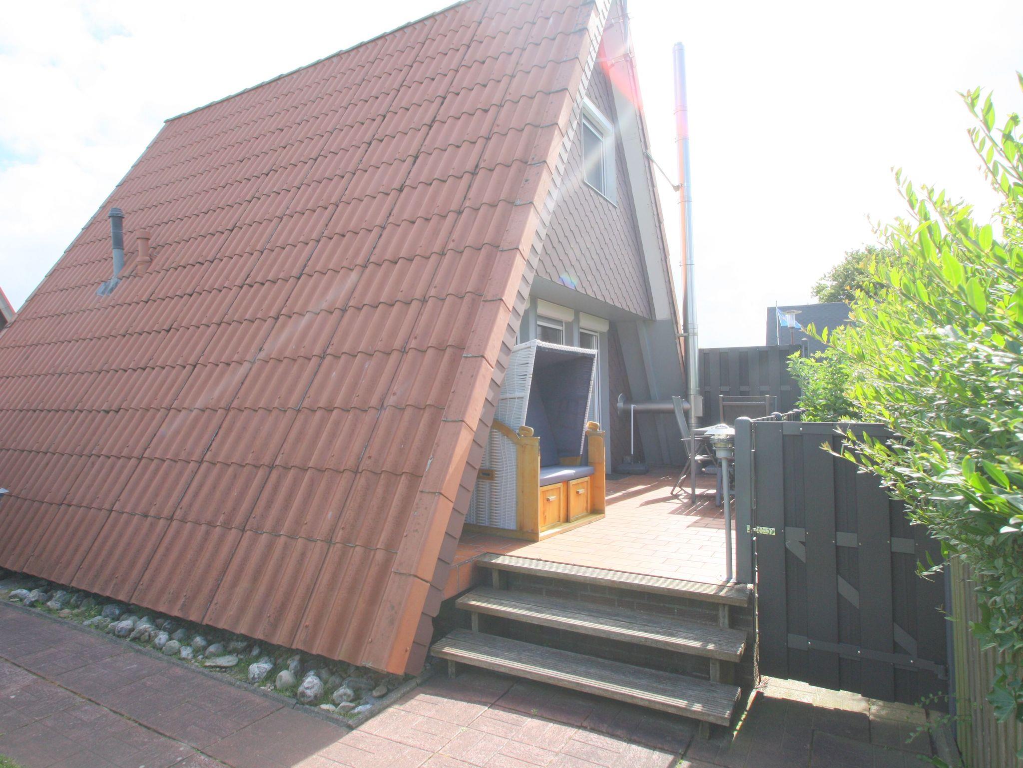 schöne Terrasse, Grillkamin, Gartenmöbel, Strandkorb,