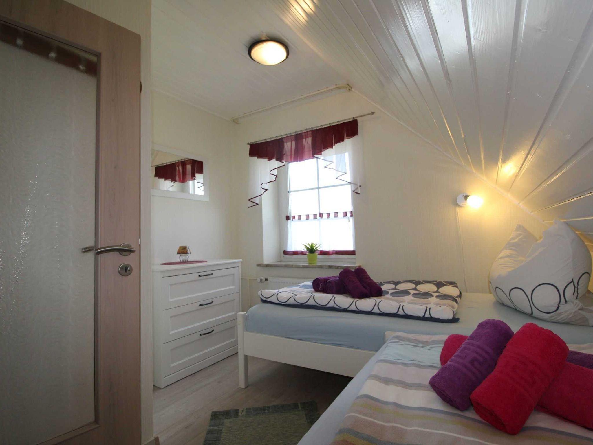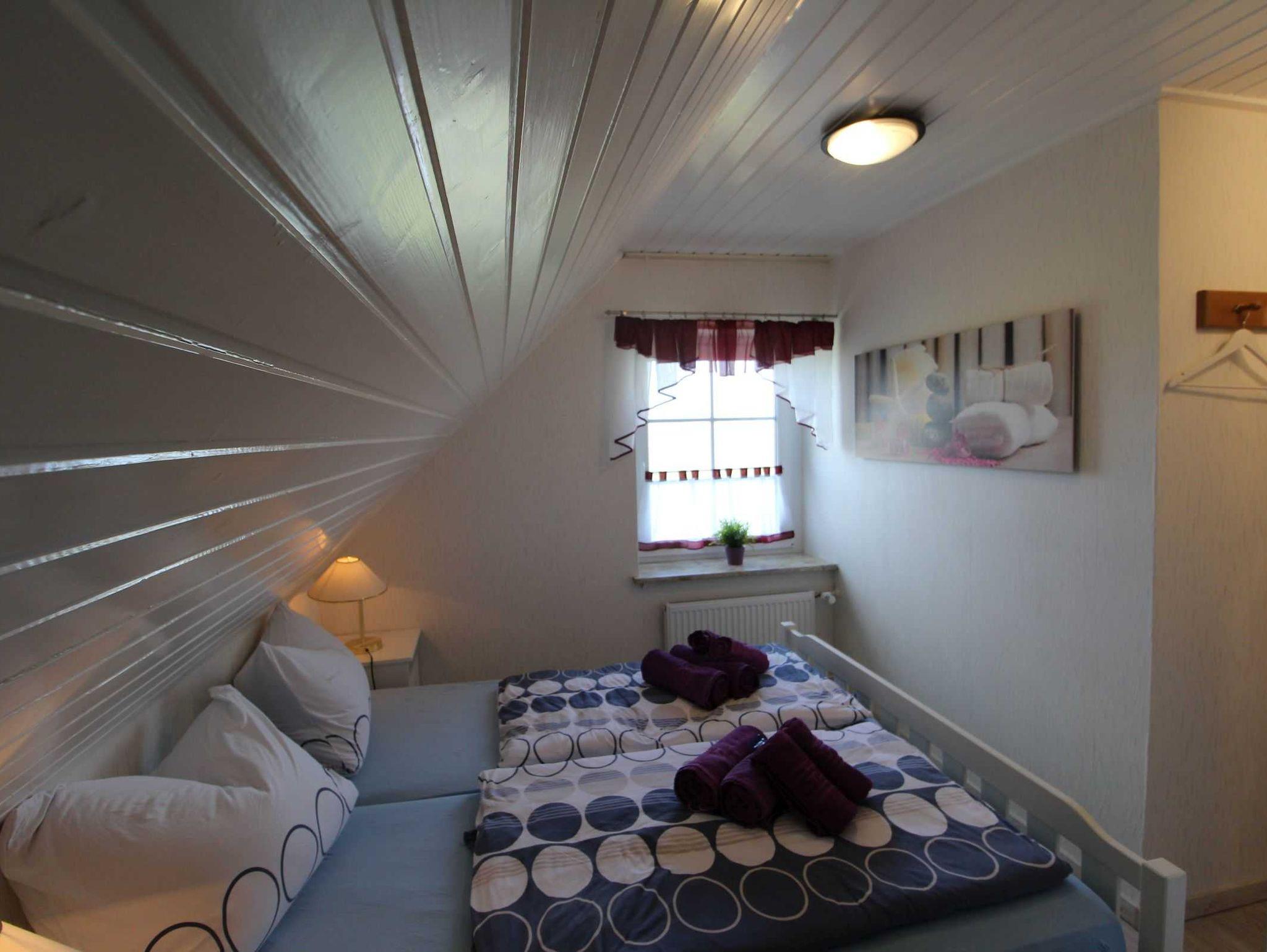 • 1 Schlafraum mit 2 getrennten Betten (1. Stock, Laminatboden)