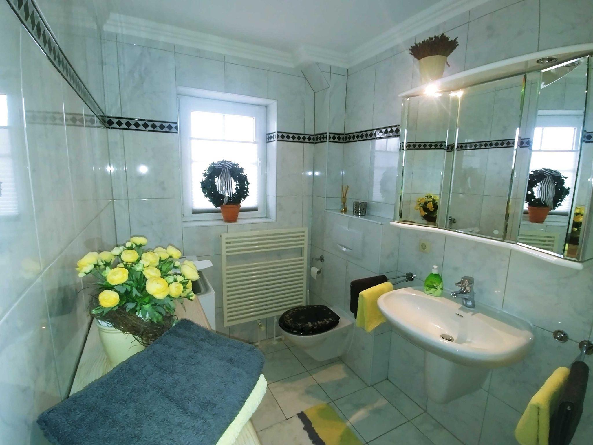 • Das Obergeschoß ist mit Vinylboden ausgelegt. Das Erdgeschoß mit Fliesen und Parkettboden.