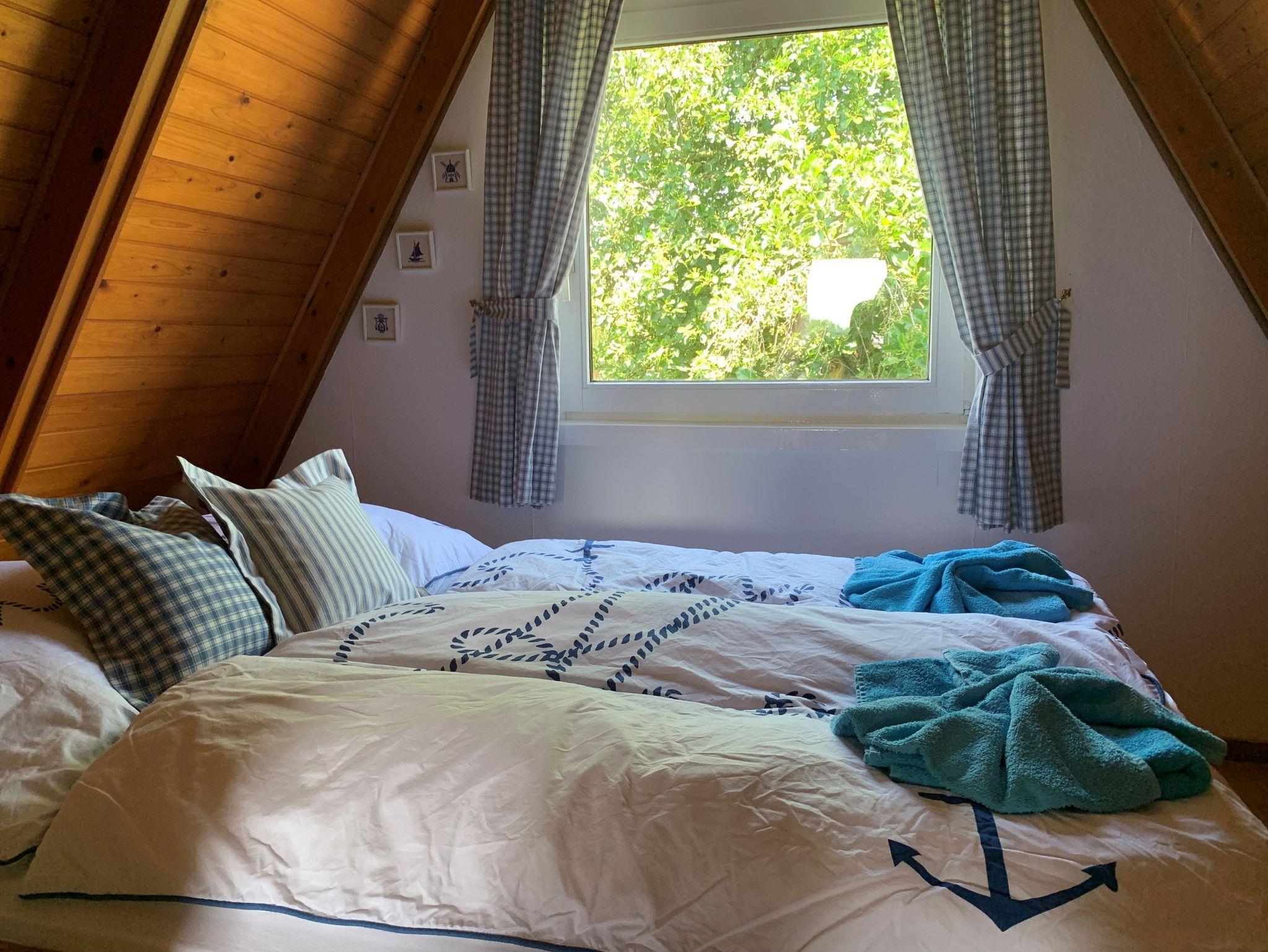 Ein Schlafzimmer im Obergeschoss verfügt über zwei Einzelbetten, die sich auch zusammenschieben lassen, während das andere Schlafzimmer über ein Doppelbett (1,40m x 2,00m) verfügt.