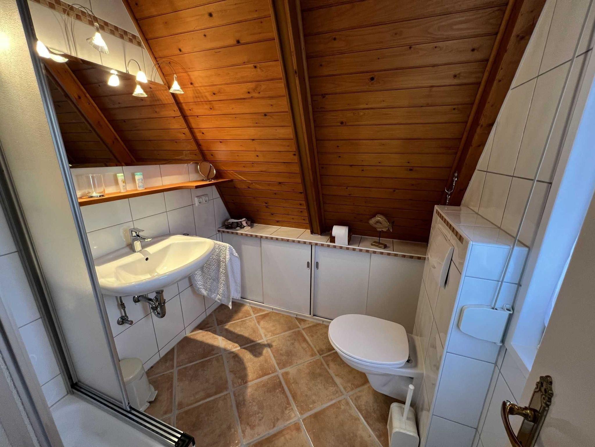 Das Badezimmer im Erdgeschoss verfügt über Dusche, WC, Waschbecken und Fön. Ein Heizkonvektor sorgt für wohlige Wärme. Eine Wasch-Trockner-Kombination ist im angrenzenden Abstellraum vorhanden.