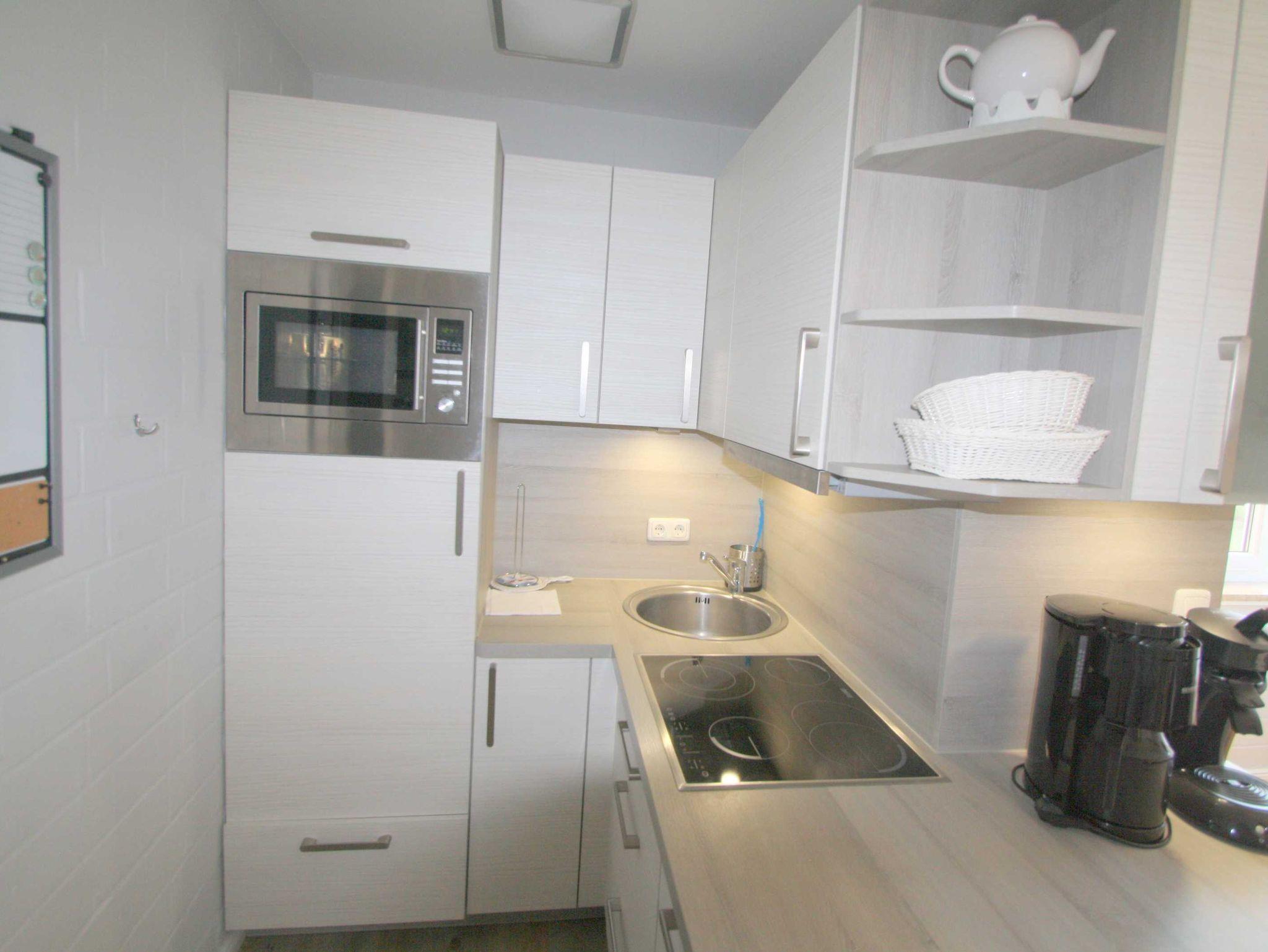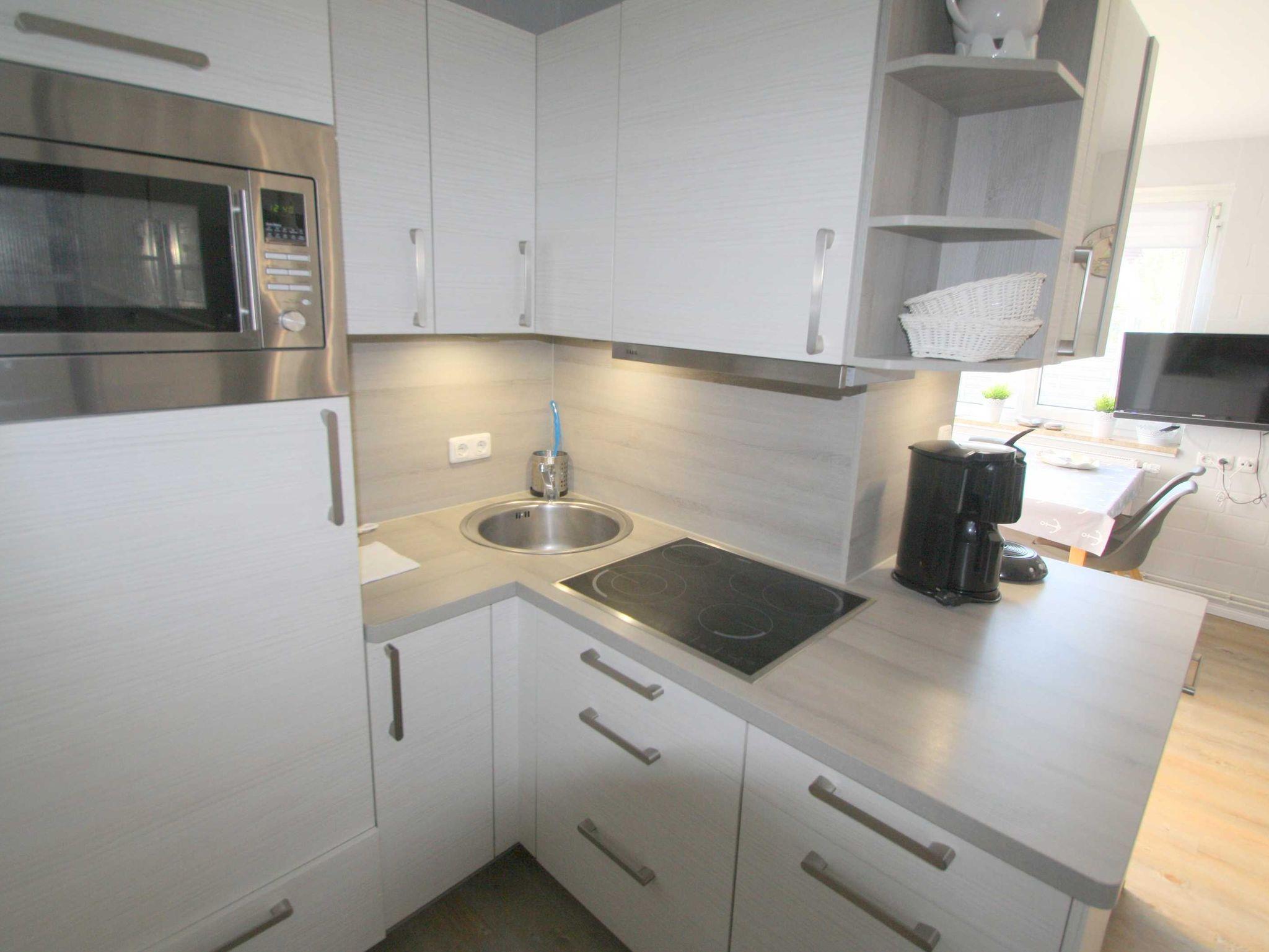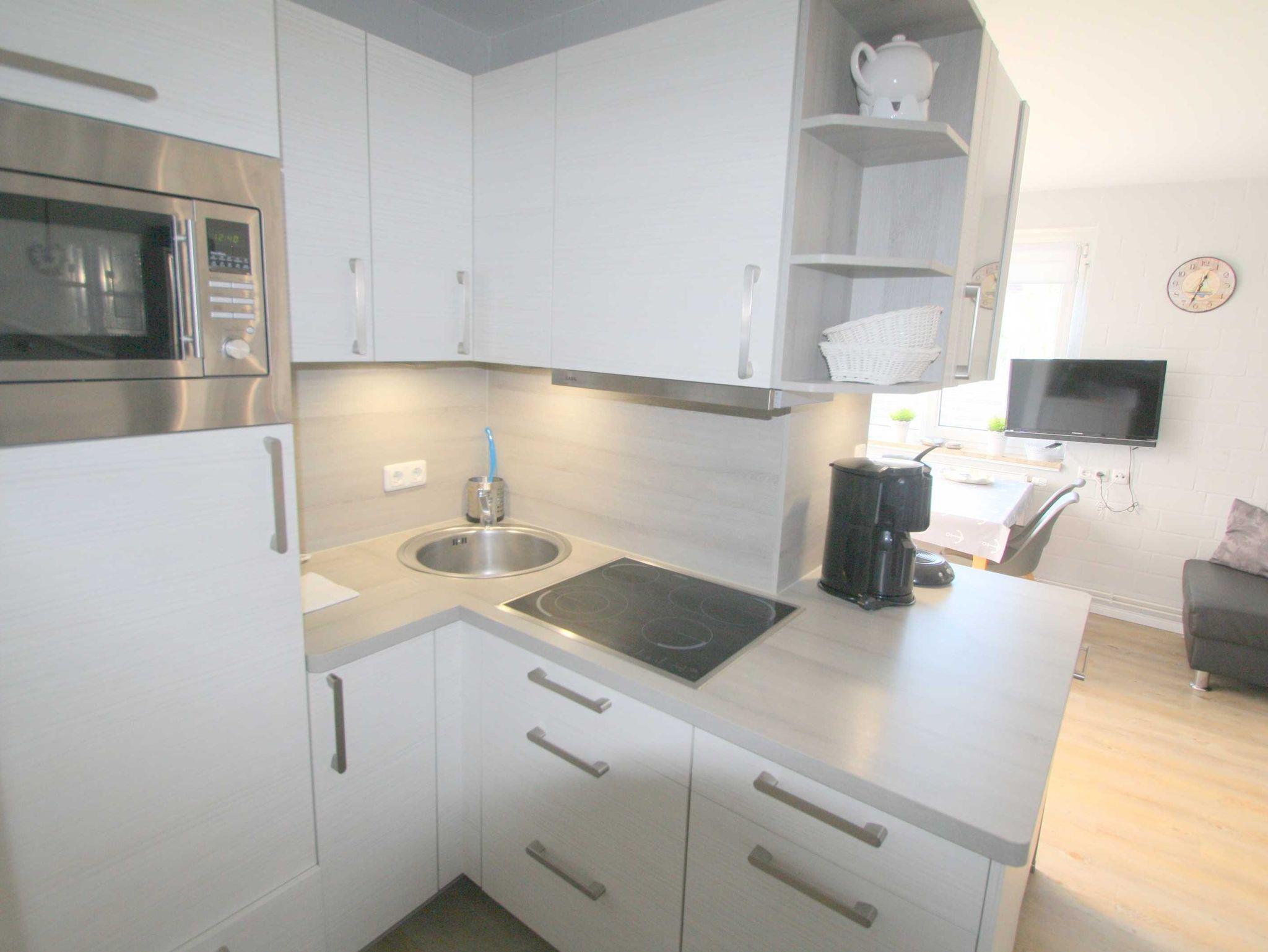 EG: Wohnzimmer mit separatem Essplatz und offener Küche (Geschirrspüler, Mikrowelle, Kühlschrank + Gefrierfach, 4 Platten-Cerankochfeld +Dunstabzughaube, (Mikrowelle mit Grillfunktion und Heizluftbackofen ca 25 Liter Volumen) Küchengeraete und Geschirr sind ausreichend vorhanden (Kaffeemaschine, Wasserkocher, Senseo, Toaster etc.)
