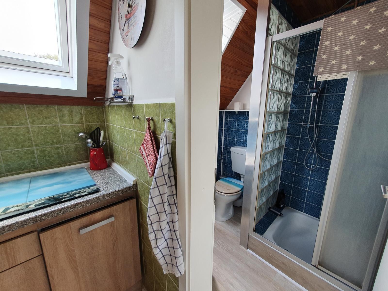 Im Badezimmer mit Tageslicht waren wir auf Stauraum bedacht. Ein Fön ist vorhanden, zudem finden Sie eine Regenschauerdusche mit Handbrause und ein niedriges kinder- und seniorenfreundliches Waschbecken vor.