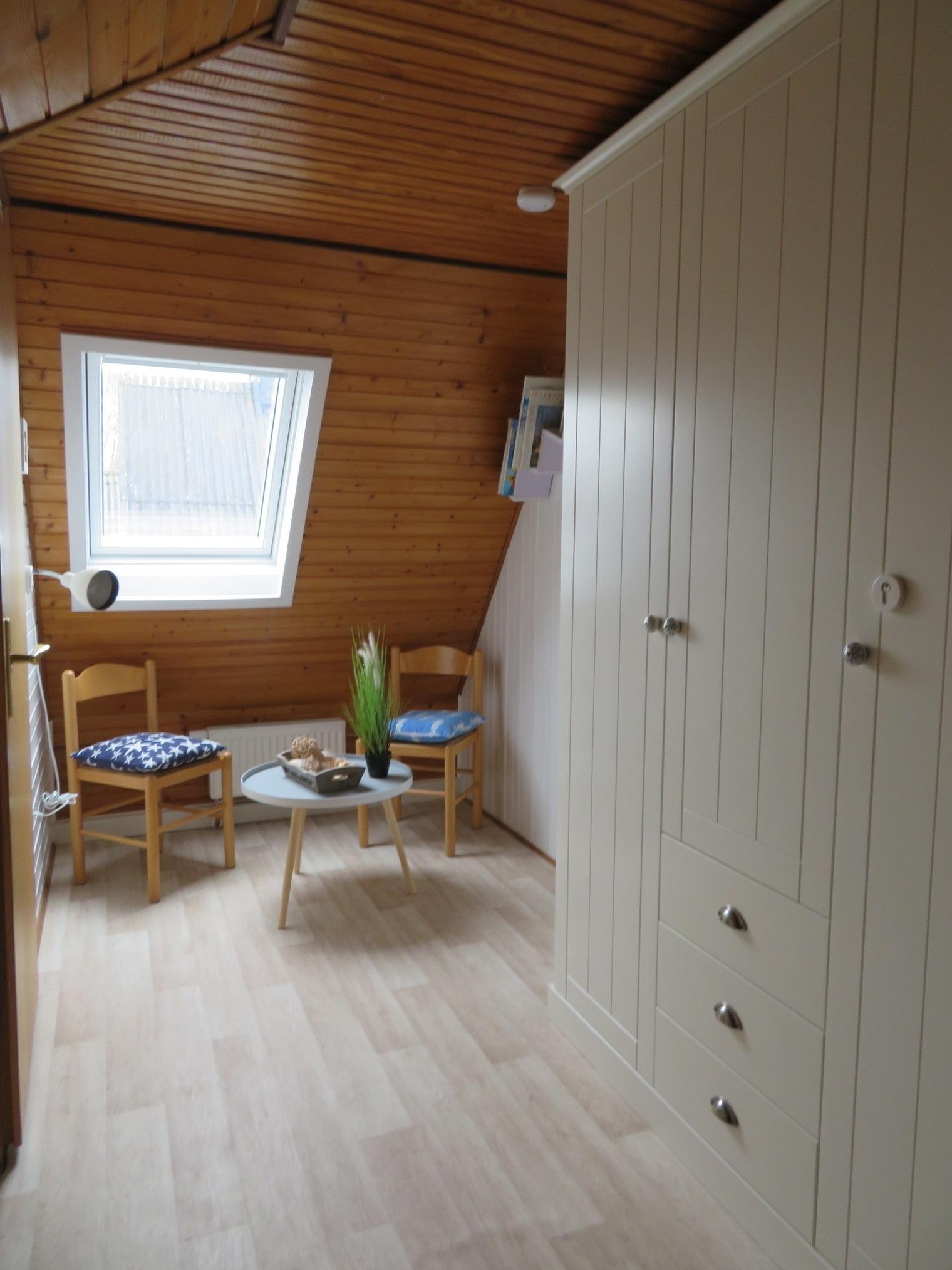 Das Schlafzimmer im OG mit seinem großen Deckfenster Richtung Deich/Meer verfügt über ein Doppelbett mit Nachttisch und Leselampe, SAT-TV, Fernseher und Sitzgelegenheiten mit Tisch. Ein separater Ankleidebereich mit Kleiderschrank befindet sich vor dem Schlafzimmer. Auch ein Lesebereich mit Büchern, Sitzgelegenheiten und Leselampe ist im OG zu finden.