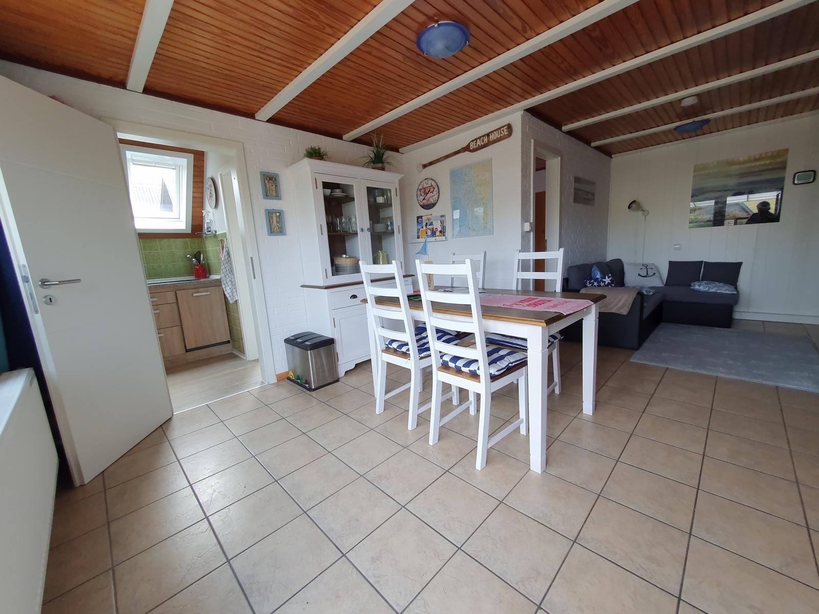 In unserem kombinierten Wohn-/Essbereich mit Couch, Essgruppe und Tisch sowie mit einem 124 cm großen Flatscreen mit SmartTV (Internet) und großer sortierter Programm- und Sendervielfalt in Deutsch und weiteren Sprachen, kostenfreies und unbegrenztes Internet (ortsübliches, langsames) WLAN, USB-Wandladesteckdose, Hi-Fi-Kompaktanlage Internet- und DAB+-Radio sowie große und große Spielesammlung für die ganze Familie können auch Schlechtwettertage super überbrückt werden. Eine Wetterstation mit satellitengesteuerter Viertages-Wettervorhersage ist ideal für die Ausflugsplanung. Garderobe, Spiegel und Schuhablage befinden sich im Eingangsbereich. Große Fenster lassen Sie auf den Deich blicken.