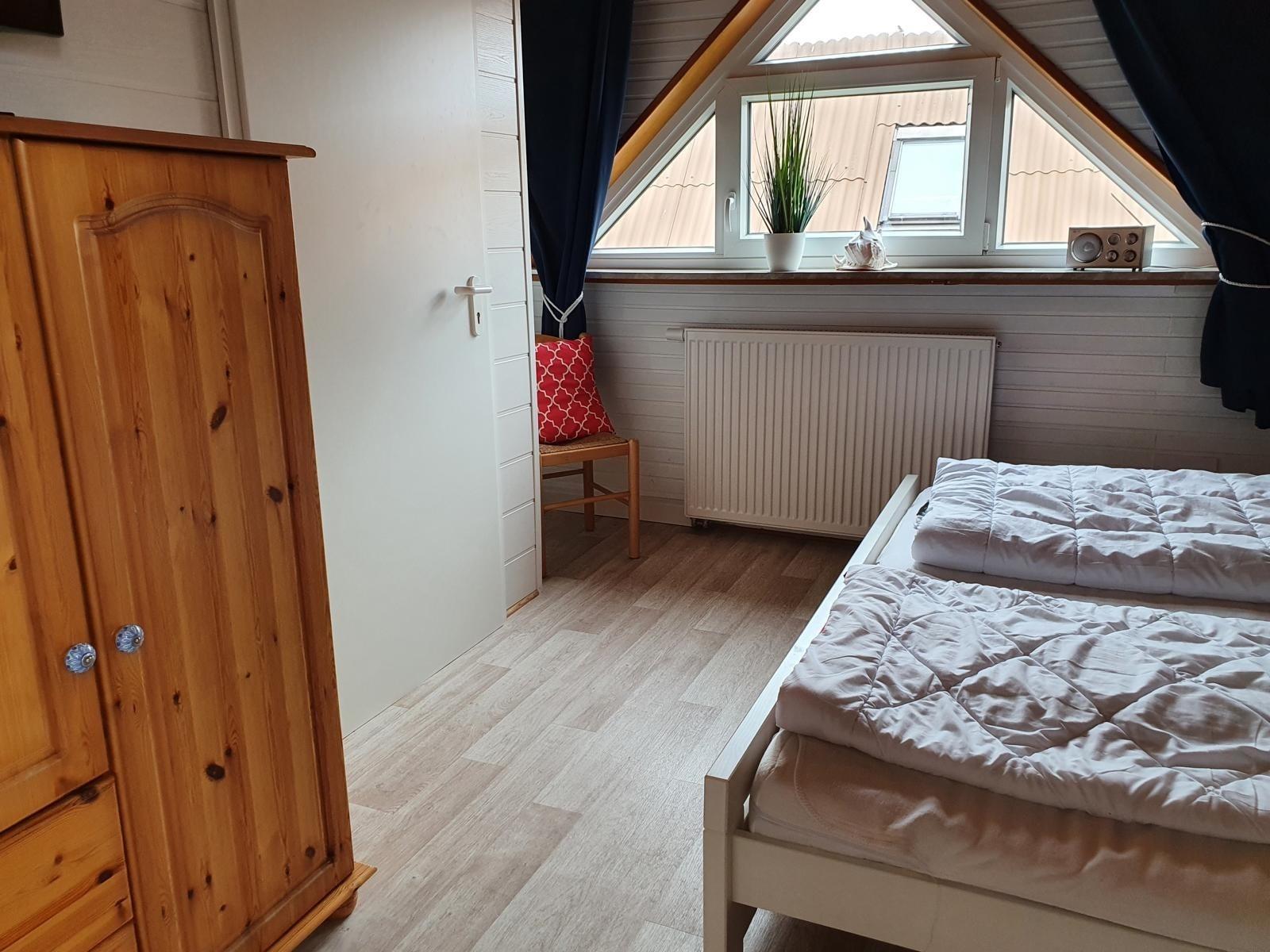 Das Schlafzimmer im OG mit seinem großen Dreieckfenster Richtung Deich/Meer verfügt über ein Doppelbett mit Nachttisch und Leselampe, SAT-TV Fernseher und Kleiderschrank.