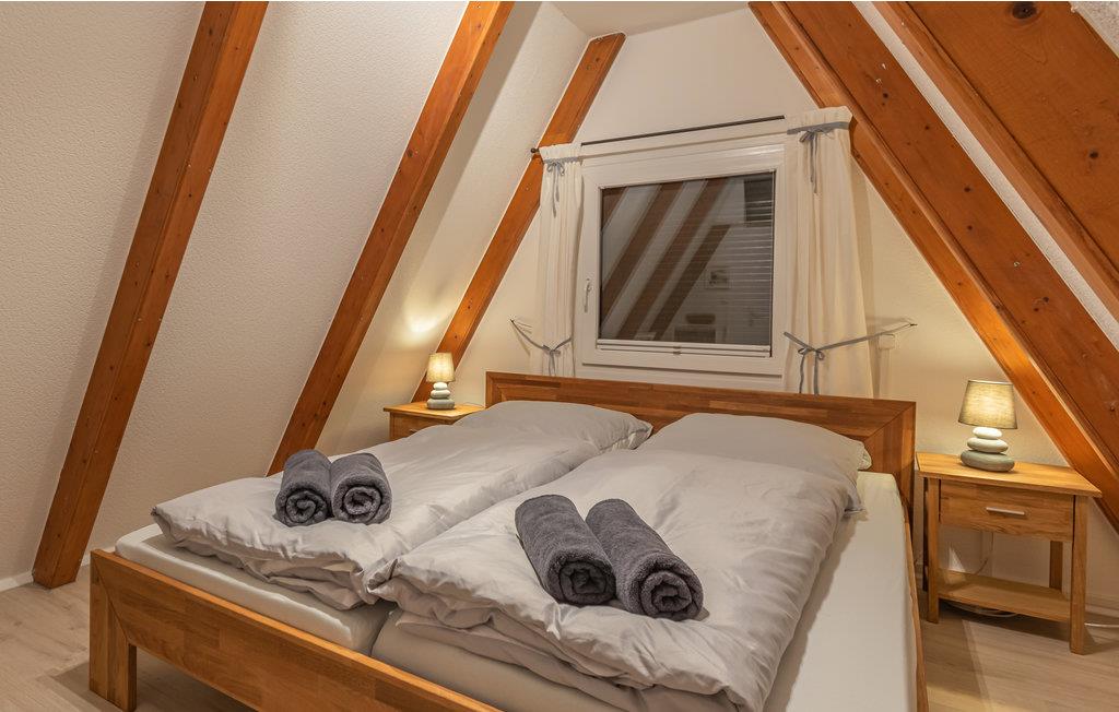 Velkommen til dette indbydende sommerhus med to soveværelser og mulighed for at medbringe et kæledyr. Det ene soveværelse har en dobbeltseng, det andet har to enkeltsenge. Indretningen er lys og smagfuld, træbjælkerne på de skrånende vægge giver værelserne en særlig stemning, og store vinduer sørger for en dejlig udsigt.