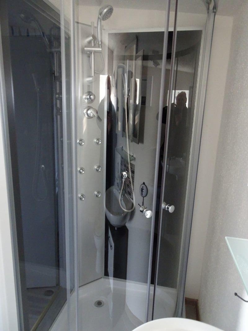 Weiterhin vorhanden ist ein Schlafzimmer mit großem Doppelbett und ein Badezimmer mit Dusche.
