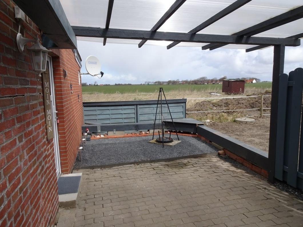 Vor dem eigenen Eingang befindet sich ein großer Terrassenbereich mit Gartenmöbeln, welcher teilweise überdacht ist.