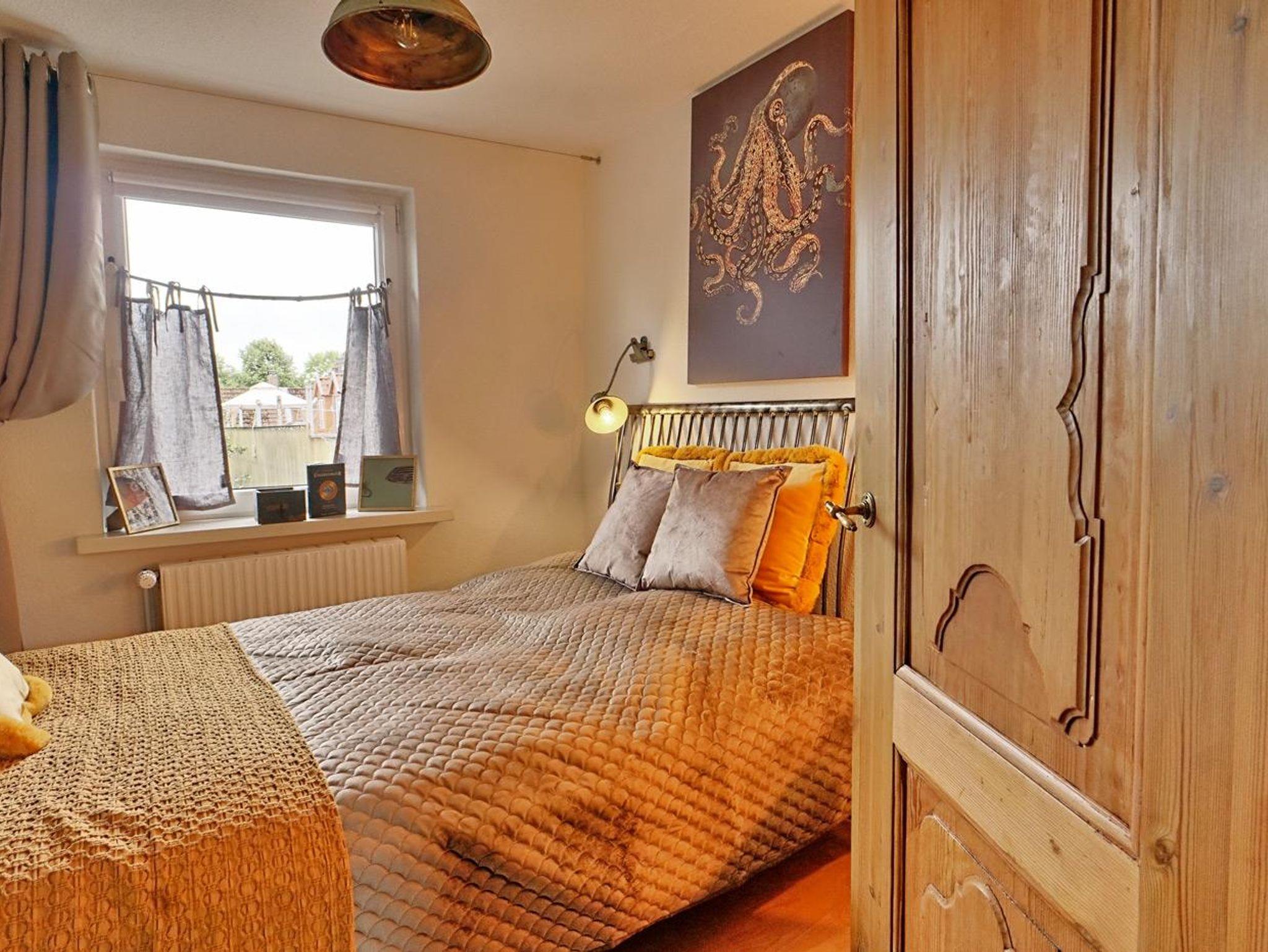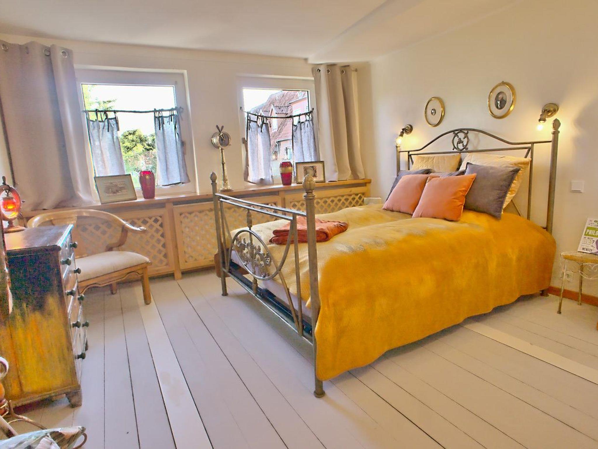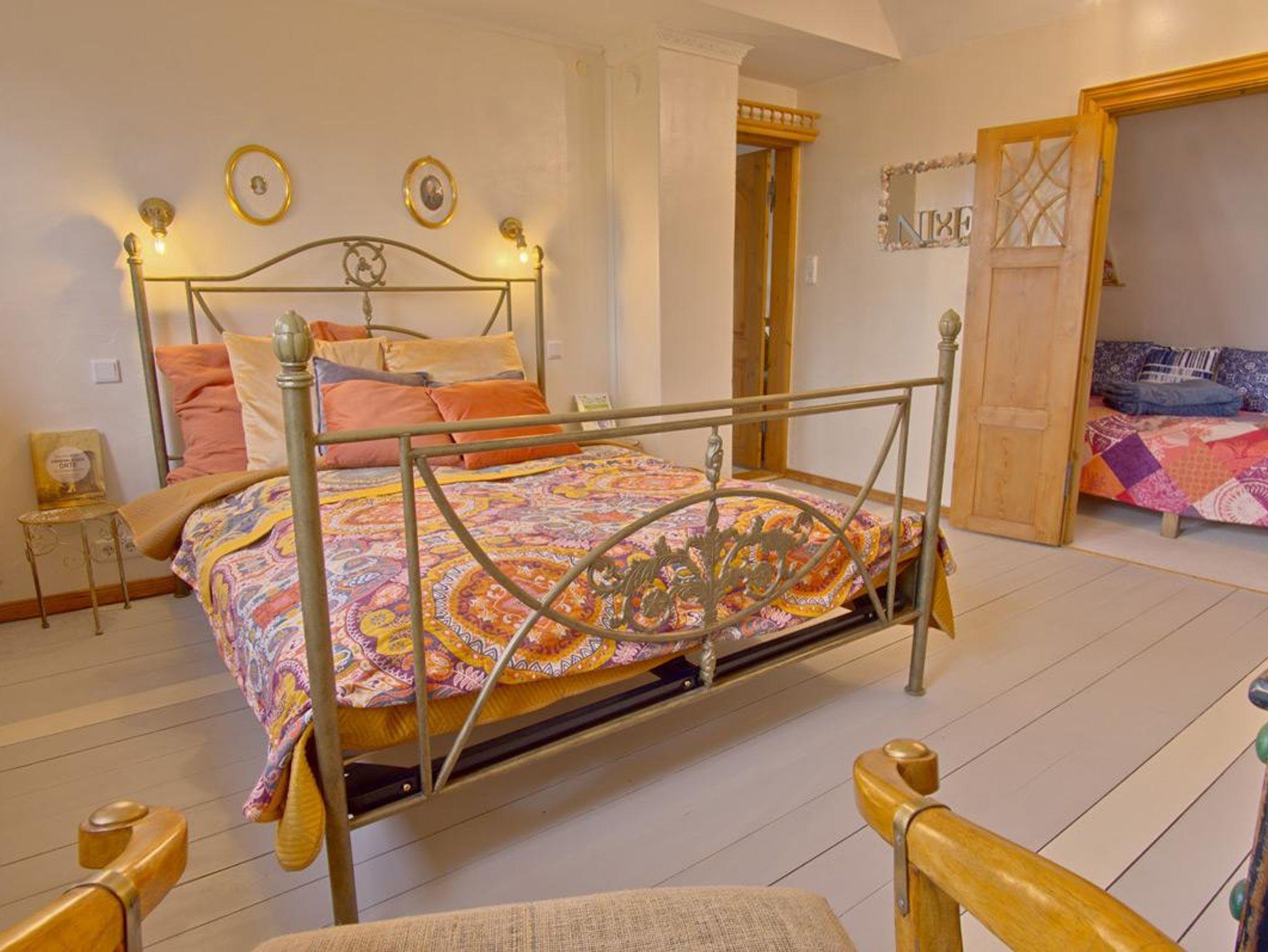 Vom Flur ausgehend betritt man links das Wohnzimmer mit dem dahinterliegenden Esszimmer. Dieses ist über eine ochsenblutrote Durchreiche mit der Küche verbunden. Hinter der handgetischlerten, vollausgestatteten Küche befindet sich ein Verbindungsflur, in wechem - durch einen Vorhang verborgen - Waschmaschine und der Flügeltrockner stehen. Der Flur führt zum (nach)mittags sonnenbeschienenen Innenhof, hinter dem die Sauna liegt. Am Ende des Flurs schließt sich das Bad mit Dusche an. Und zurück zur Diele des Hauses: Von hier aus geht es über die Treppe zu einem großen Schlafzimmer mit einem 1,60 m großen goldenen Doppelbett. Kleidung findet Platz in einer edlen Hängegarderobe und einer Künstlerkommode. An das große Schlafzimmer schließt sich eine winzige, niedrige Kammer an, die durch eine leichte Tür verschlossen werden kann, und in der eine fünfte Person in einem 90 cm breiten Bett schlafen kann. Neben dem großen Schlafzimmer liegt ein kleines Schlafzimmer, das fast komplett von einem 1,40 m großen, edlen Bett ausgefüllt ist und in dem sich ein zweiter Fernseher befindet. Dieser hat allerdings nur Antennenempfang, das heißt, dass die privaten Sender nicht zu sehen sind. Außerdem steht hier eine weitere Hängegarderobe und eine Künstlerkommode. Zum Kuscheln, Träumen, Ausruhen, Lesen, Fernsehen ist der Raum ideal.