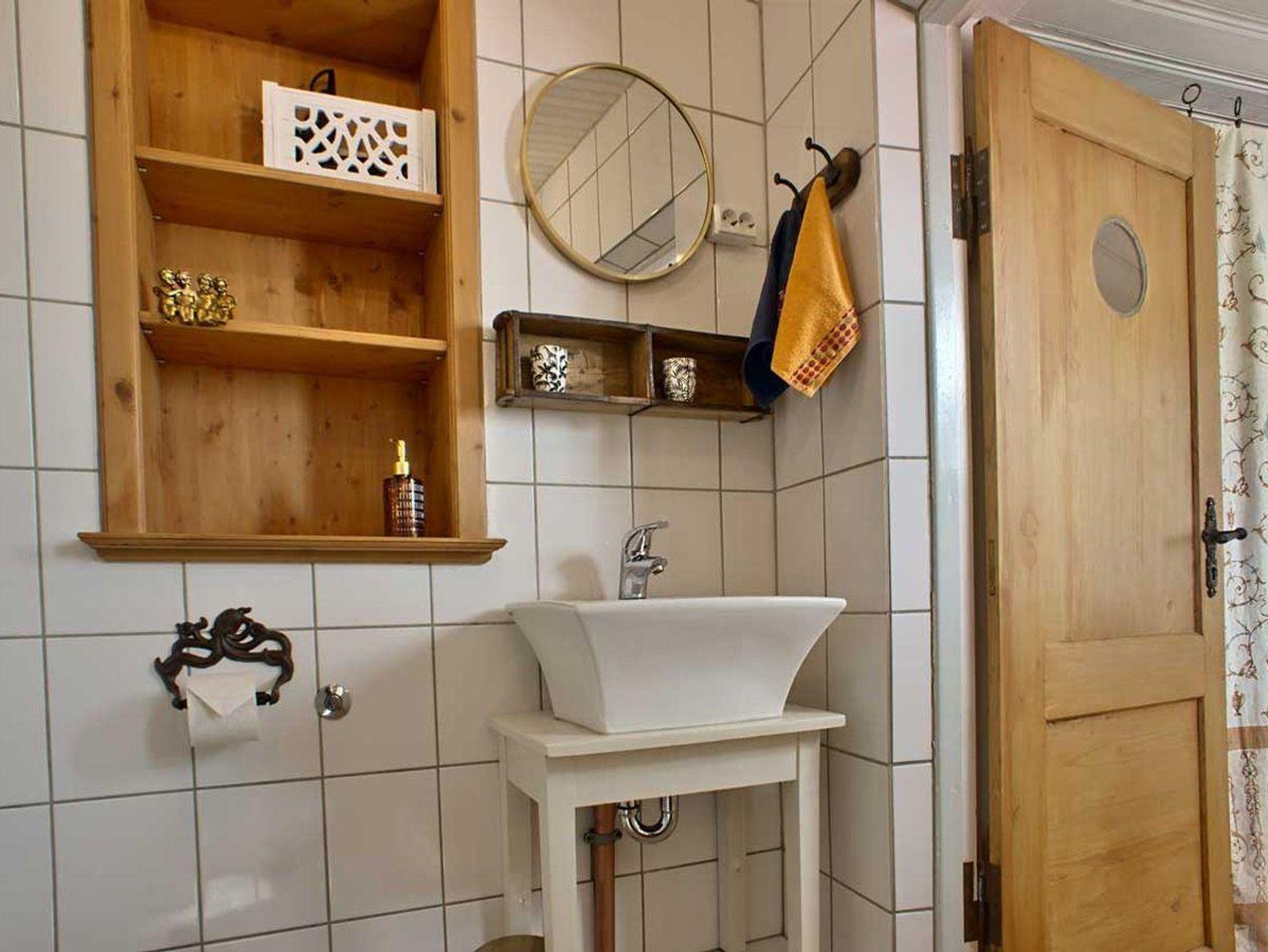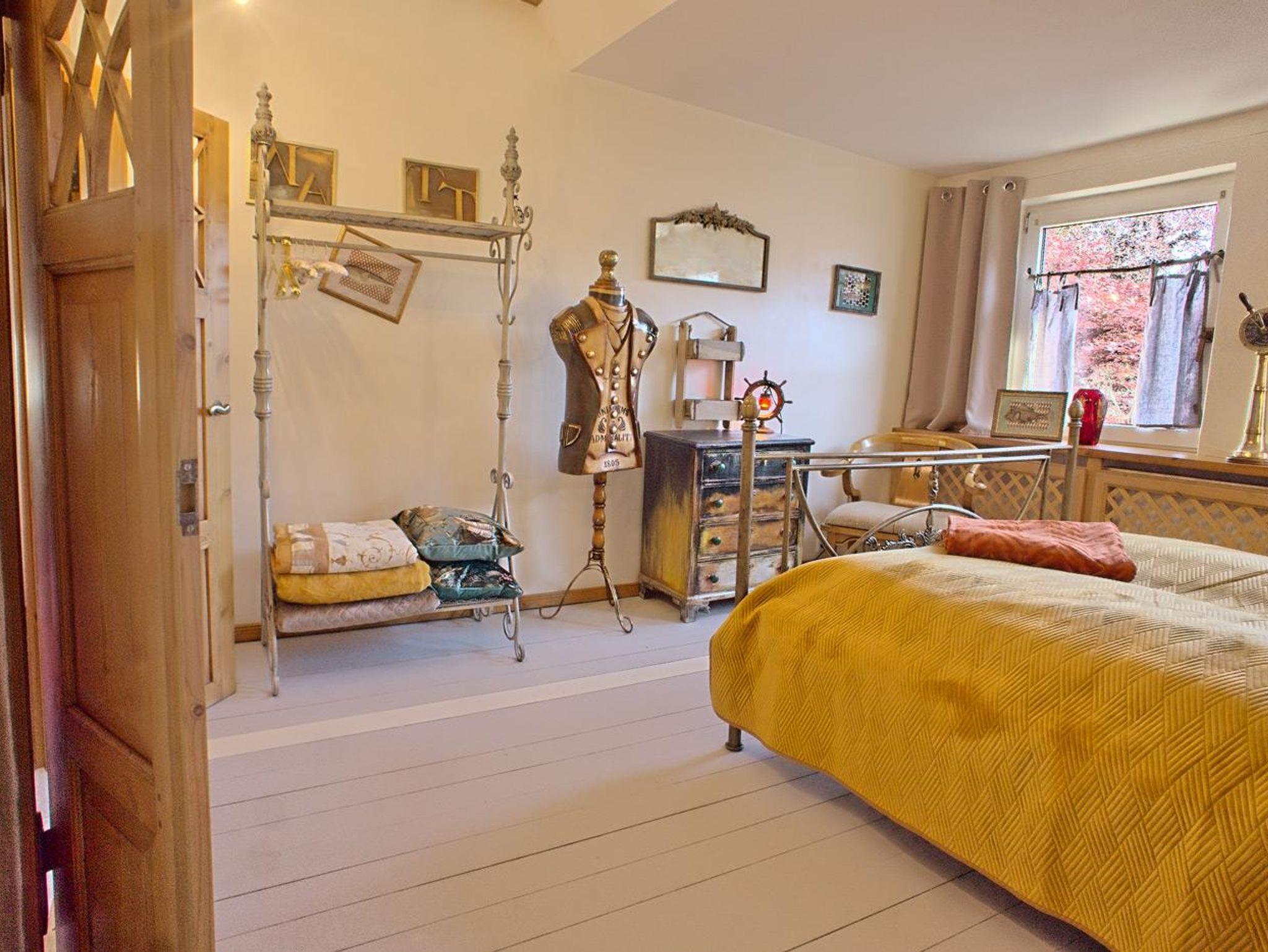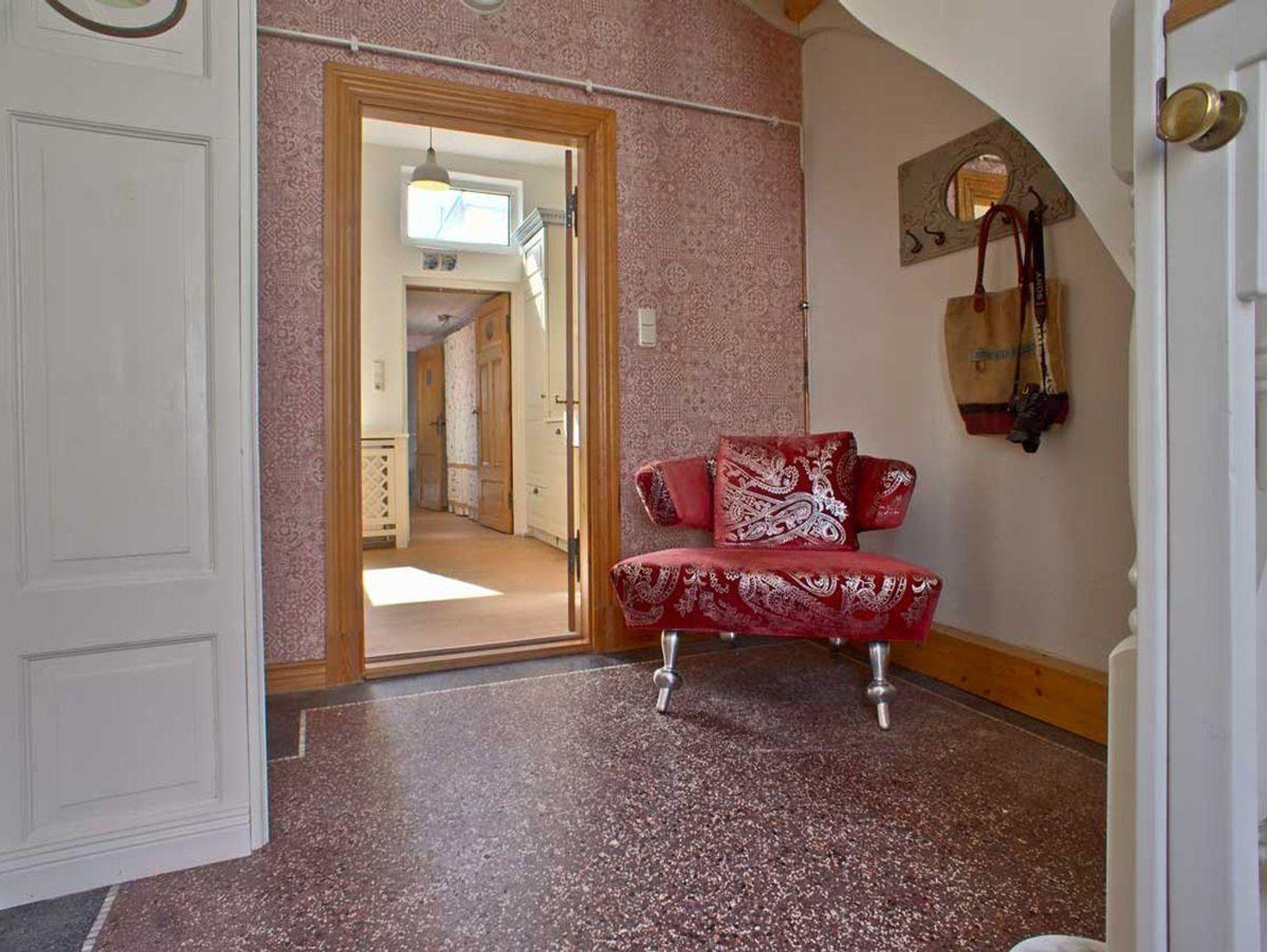 Vom Flur ausgehend betritt man links das Wohnzimmer mit dem dahinterliegenden Esszimmer. Dieses ist über eine ochsenblutrote Durchreiche mit der Küche verbunden. Hinter der handgetischlerten, vollausgestatteten Küche befindet sich ein Verbindungsflur, in wechem - durch einen Vorhang verborgen - Waschmaschine und der Flügeltrockner stehen. Der Flur führt zum (nach)mittags sonnenbeschienenen Innenhof, hinter dem die Sauna liegt. Am Ende des Flurs schließt sich das Bad mit Dusche an. Und zurück zur Diele des Hauses: Von hier aus geht es über die Treppe zu einem großen Schlafzimmer mit einem 1,60 m großen goldenen Doppelbett. Kleidung findet Platz in einer edlen Hängegarderobe und einer Künstlerkommode. An das große Schlafzimmer schließt sich eine winzige, niedrige Kammer an, die durch eine leichte Tür verschlossen werden kann, und in der eine fünfte Person in einem 90 cm breiten Bett schlafen kann. Neben dem großen Schlafzimmer liegt ein kleines Schlafzimmer, das fast komplett von einem 1,40 m großen, edlen Bett ausgefüllt ist und in dem sich ein zweiter Fernseher befindet. Dieser hat allerdings nur Antennenempfang, das heißt, dass die privaten Sender nicht zu sehen sind. Außerdem steht hier eine weitere Hängegarderobe und eine Künstlerkommode. Zum Kuscheln, Träumen, Ausruhen, Lesen, Fernsehen ist der Raum ideal.
