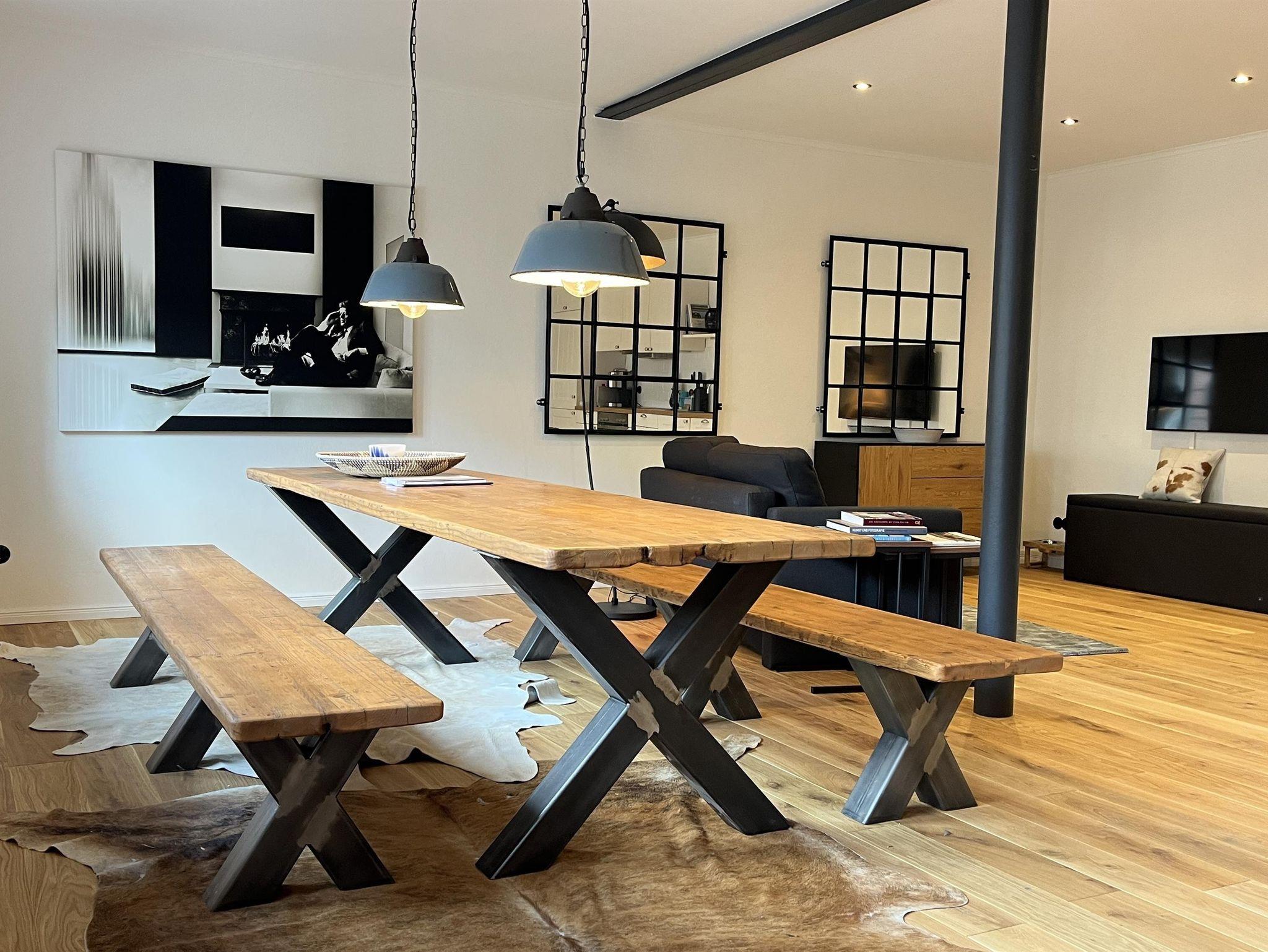 Das Loft verfügt über ein sehr schönes Schlafzimmer, daß vom Ess- und Wohn durch eine Glas/Stahlwand getrennt ist und abgedunkelt werden kann. Im Wohnbereich befindet sich ein Schlafsofa, auf dem ein bis zwei weitere Personen schlafen können. Am großzügigen Esstisch kann man arbeiten oder Mahlzeiten einnehmen.