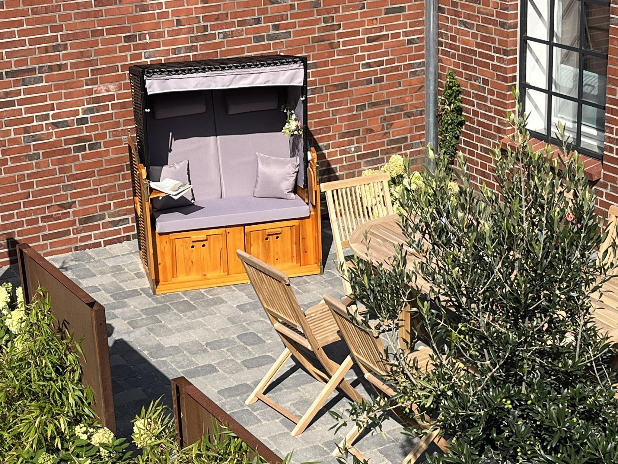 Bei schönem Wetter kann man auf der Sonnenterasse im Strandkorb sitzen oder am großen 6er Tisch arbeiten oder Mahlzeiten einnehmen.