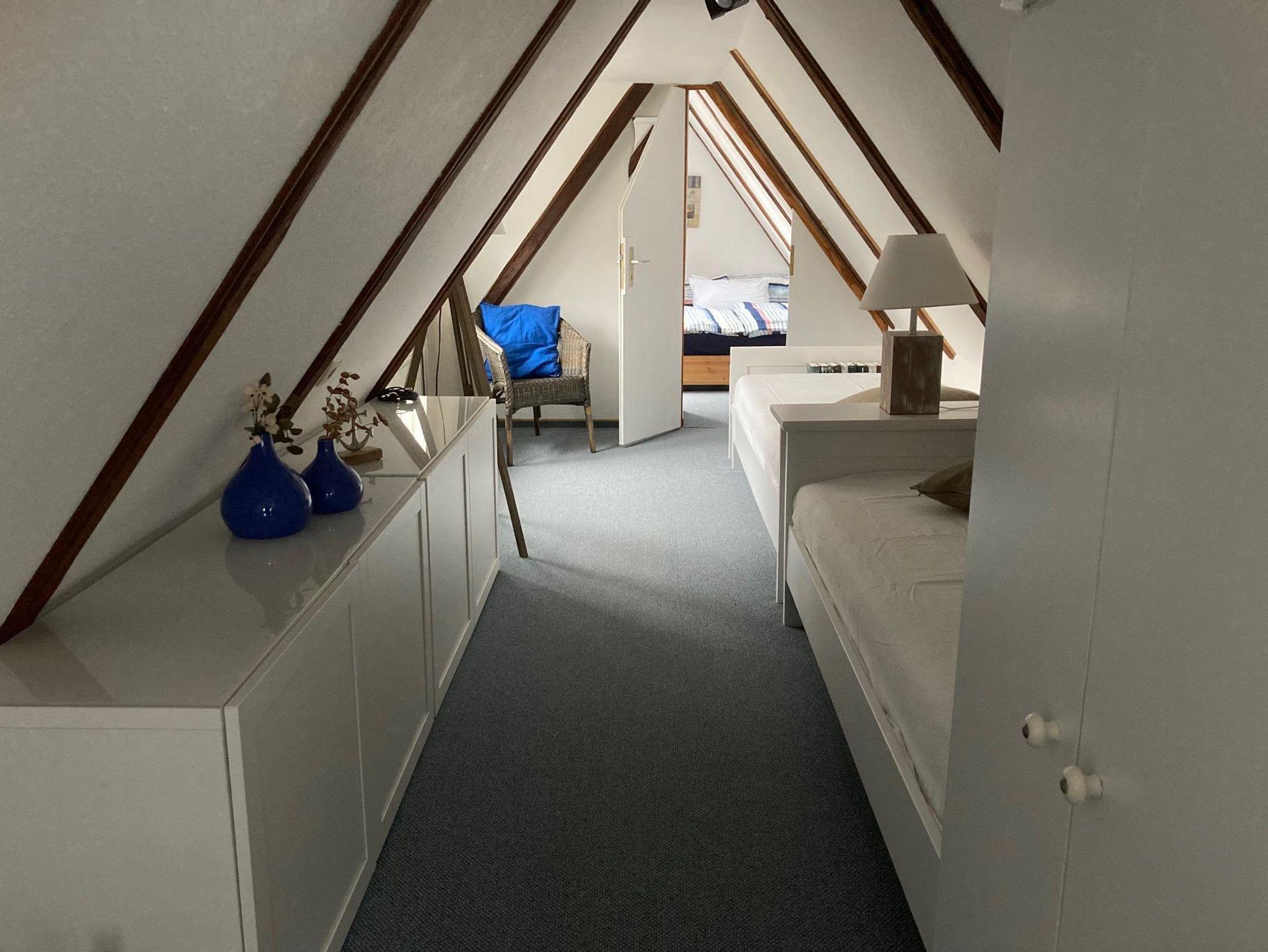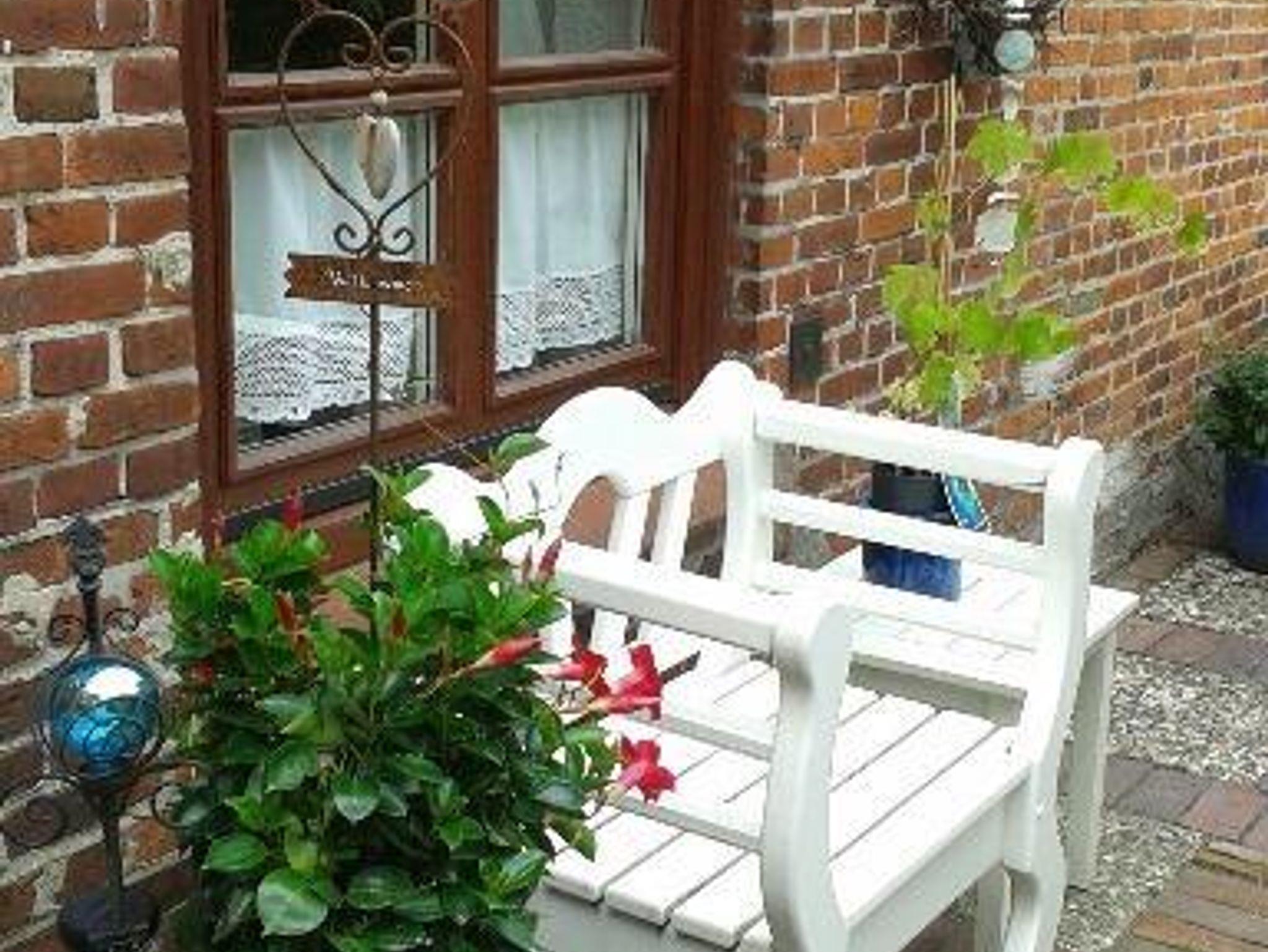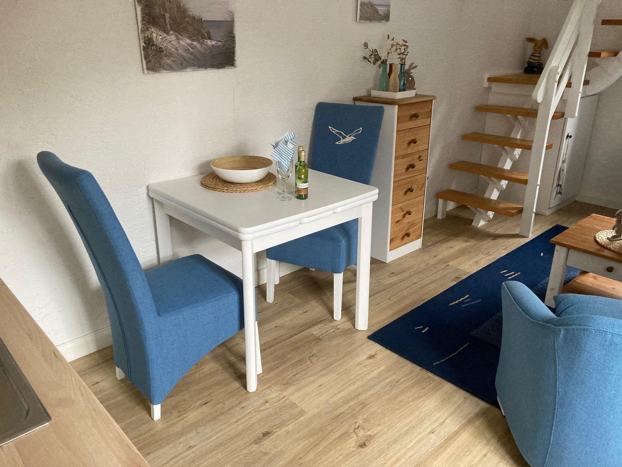 Die zweigeschossige, gemütliche und ruhige Ferienwohnung befindet sich im Anbau des Hauses mit eigenem Eingang im Innenhof. Sie wurde mit viel Liebe zum Detail renoviert und eingerichtet. Im Erdgeschoss befinden sich Bad mit Dusche und WC sowie eine kleine Diele mit Einbauschrank für die Garderobe und der Wohnraum mit einer gut ausgestatteten Küchenzeile und einem Essplatz.