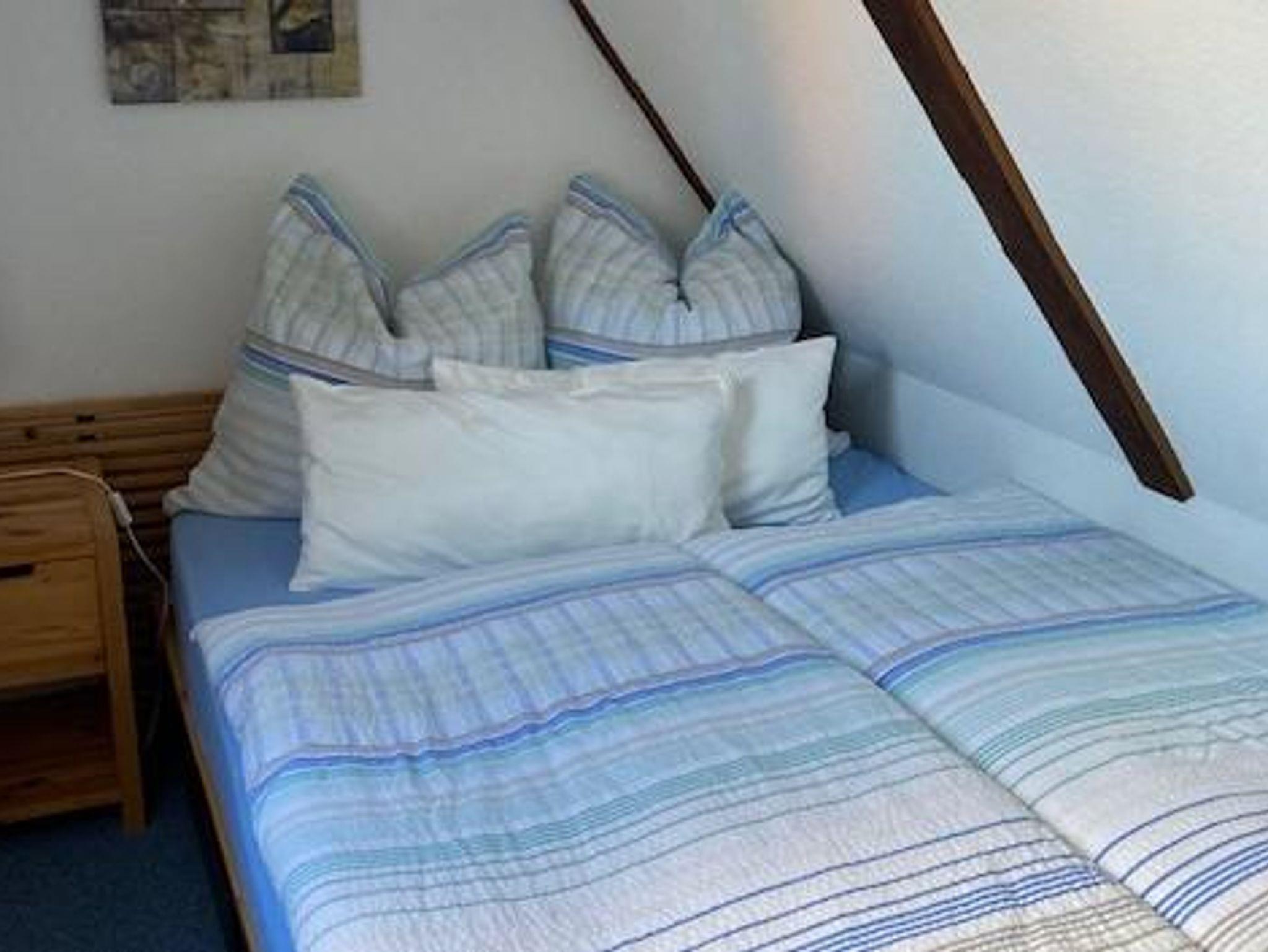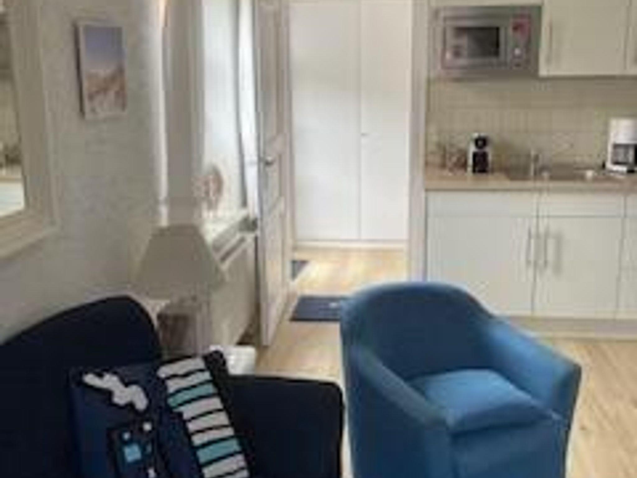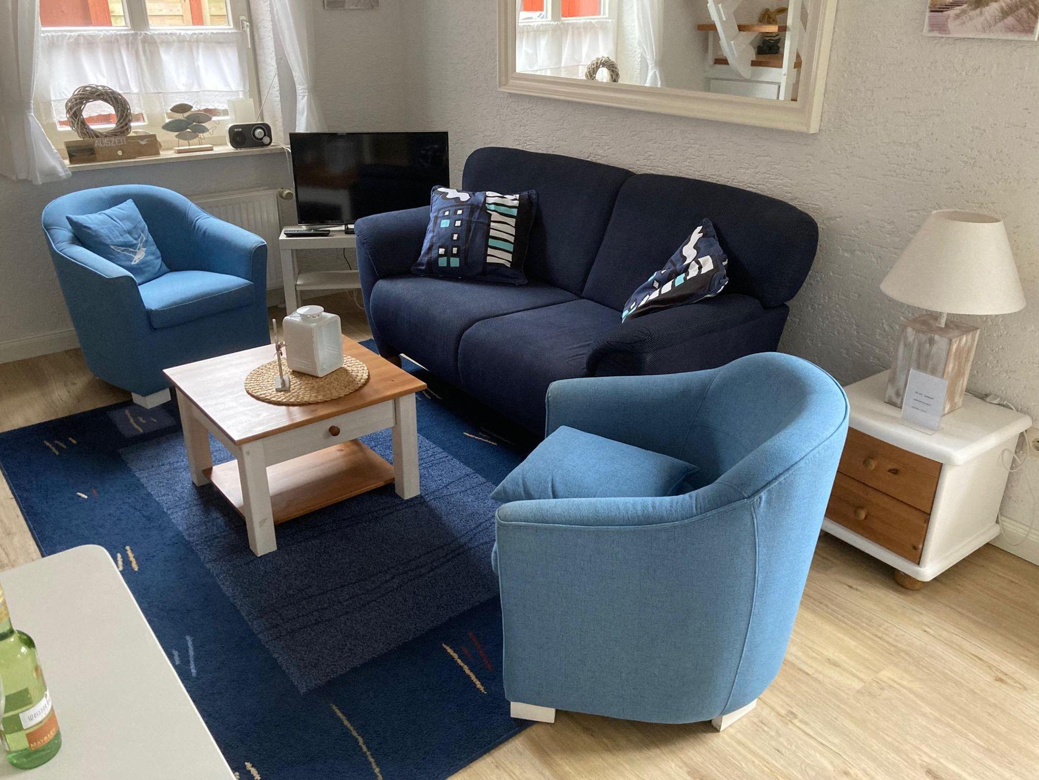 Die Sitzecke mit Couch und Sessel lädt zum entspannen ein. Tischleuchten Lampen in den dekorierten Fensternischen strahlen eine nordische Atmosphäre aus. Es wirkt hyggelig und gemütlich. Ein Flachbildfernseher mit Kabelanschluss und ein Radio mit CD-Player sind selbstverständlich vorhanden.
