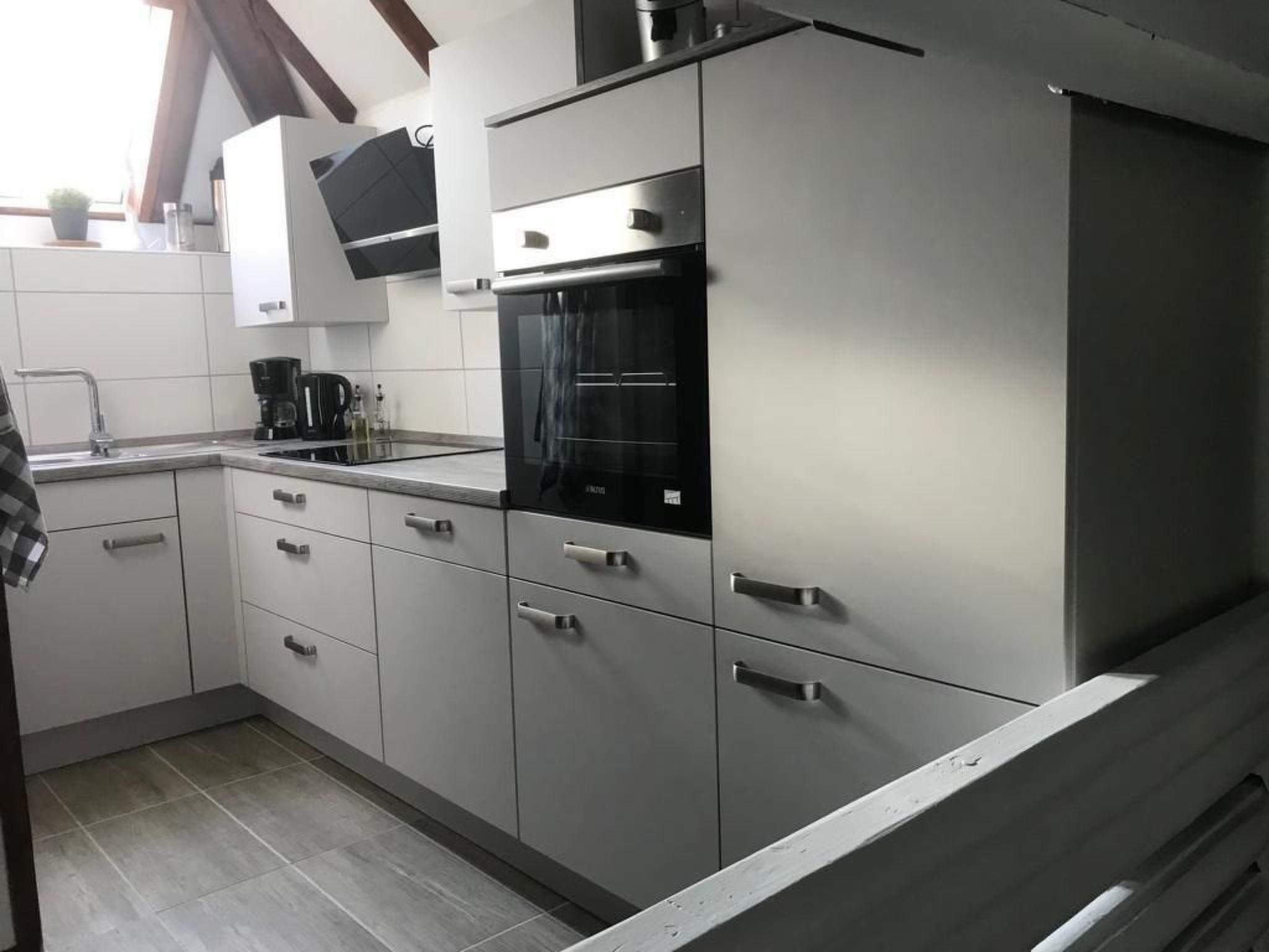 Inside, you can expect a living space of 80 m², spread over three lovingly designed levels. The entrance to the house leads you through a hallway into the open-plan living and dining area. In the living room, a comfortable seating area, a large-screen LED TV and a spacious, solid brick fireplace invite you to linger. An adjoining, spacious seating area, which also serves as a dining room, provides a cosy setting for shared meals. The gallery, accessible via a small staircase, houses a newly fitted kitchen (since December 2018) with modern amenities such as a dishwasher, freezer compartment and microwave, as well as a shower room and a bedroom with adjoining toilet room.