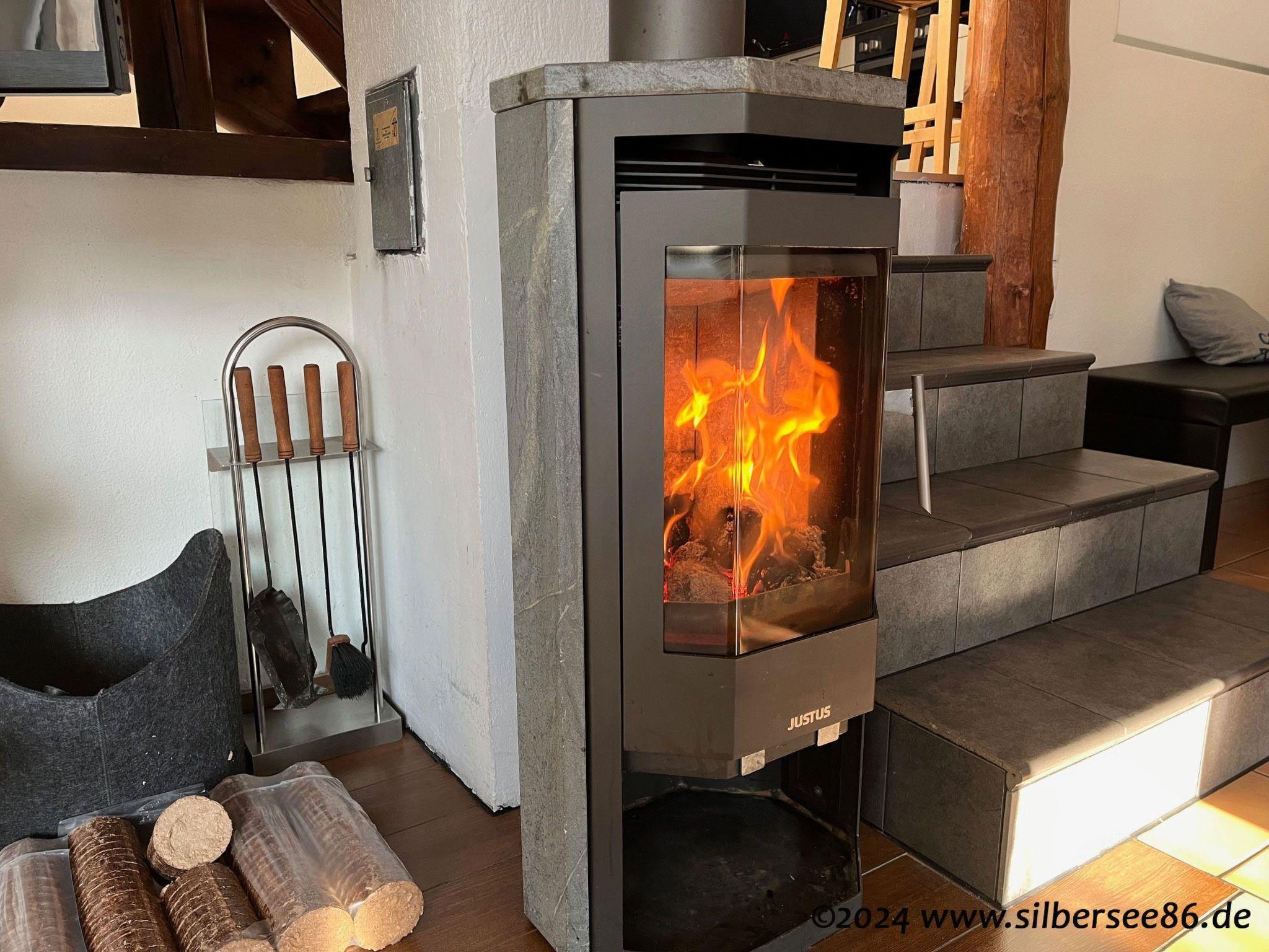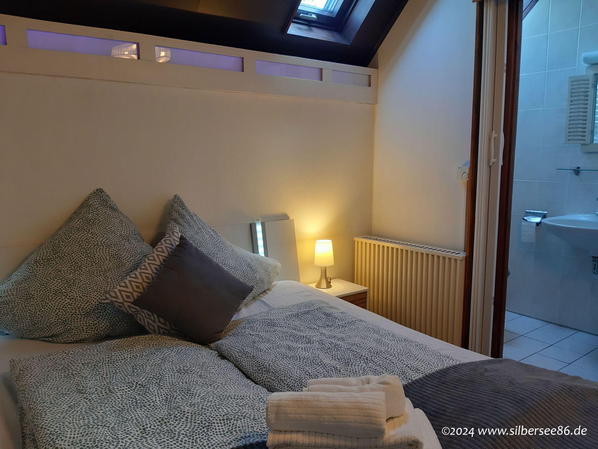 Cosy living room with L-shaped sofa bed (approx. 140 cm x 200 cm), two armchairs, wood-burning stove, large dining area, 42" LCD flatscreen TV with DVD player, satellite receiver, Dolby Surround System, floor-to-ceiling windows with direct access to the large, beautifully landscaped terrace, air-conditioned (!) living area with additional ceiling fan above the sofa bed. 3 bedrooms, each with a double bed (one of which has a double bed). Bedrooms each with a double bed (including 1 double bed with a large 1.60m x 2.00m mattress - please note: 1 large sheet required), LCD flatscreen TV with DVD player and satellite receiver, safe, indirect stylish lighting. The two bedrooms on the upper floor of the house have access to the balcony, one bedroom also has its own washbasin. The bedroom on the mezzanine floor of the house has its own toilet with washbasin. Fully equipped kitchen with ceramic hob, convection oven, microwave, dishwasher, fridge-freezer, kettle, toaster, coffee machine and crockery. Bathroom 1: shower, WC and washbasin Bathroom 2: WC with washbasin (next to the bedroom on the mezzanine floor) Balcony and terrace with seating; laundry can be done at reception or in the laundry room of the Silbersee holiday park for a fee.