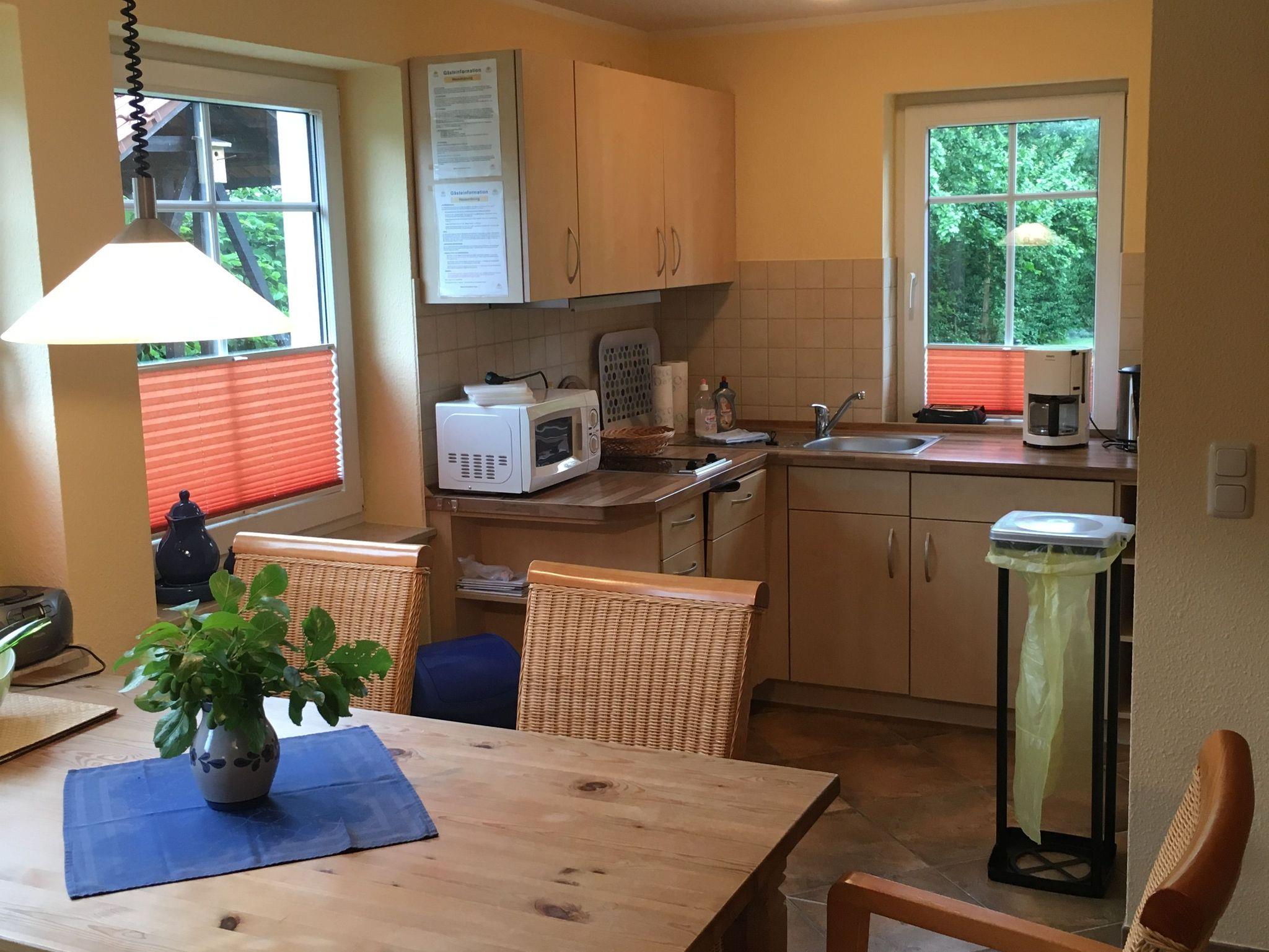 komfortable Küche mit Cerankochfeld, Geschirrspüler, Toaster, Wasserkocher, Kaffeemaschine, sowie Kühlschrank mit Gefrierfach, Heißluftfriteuse
