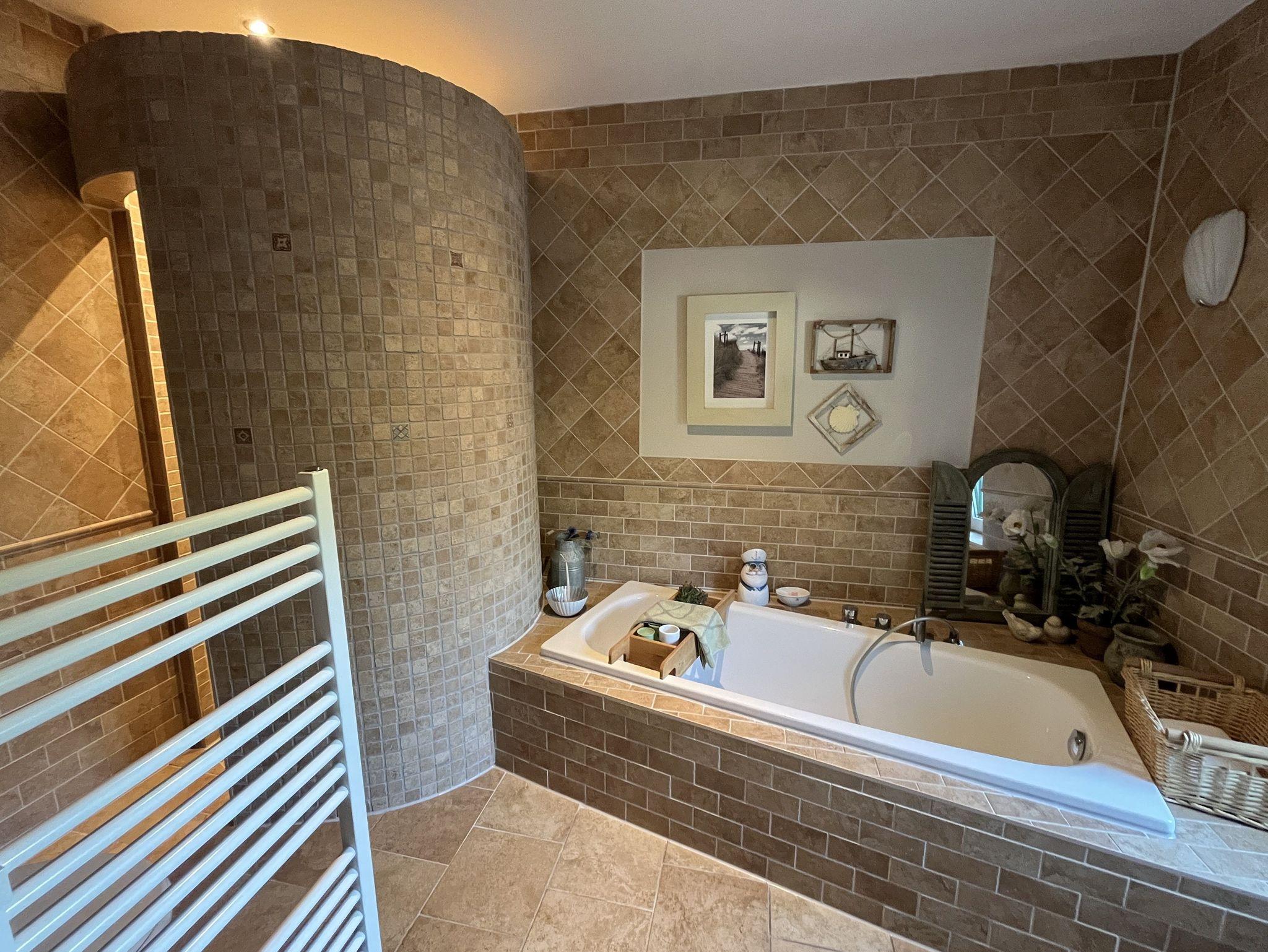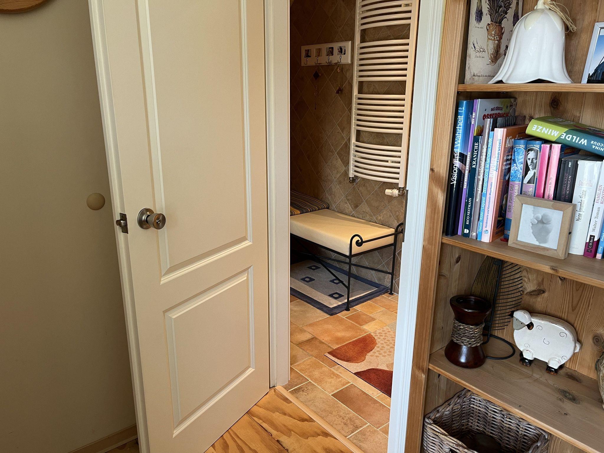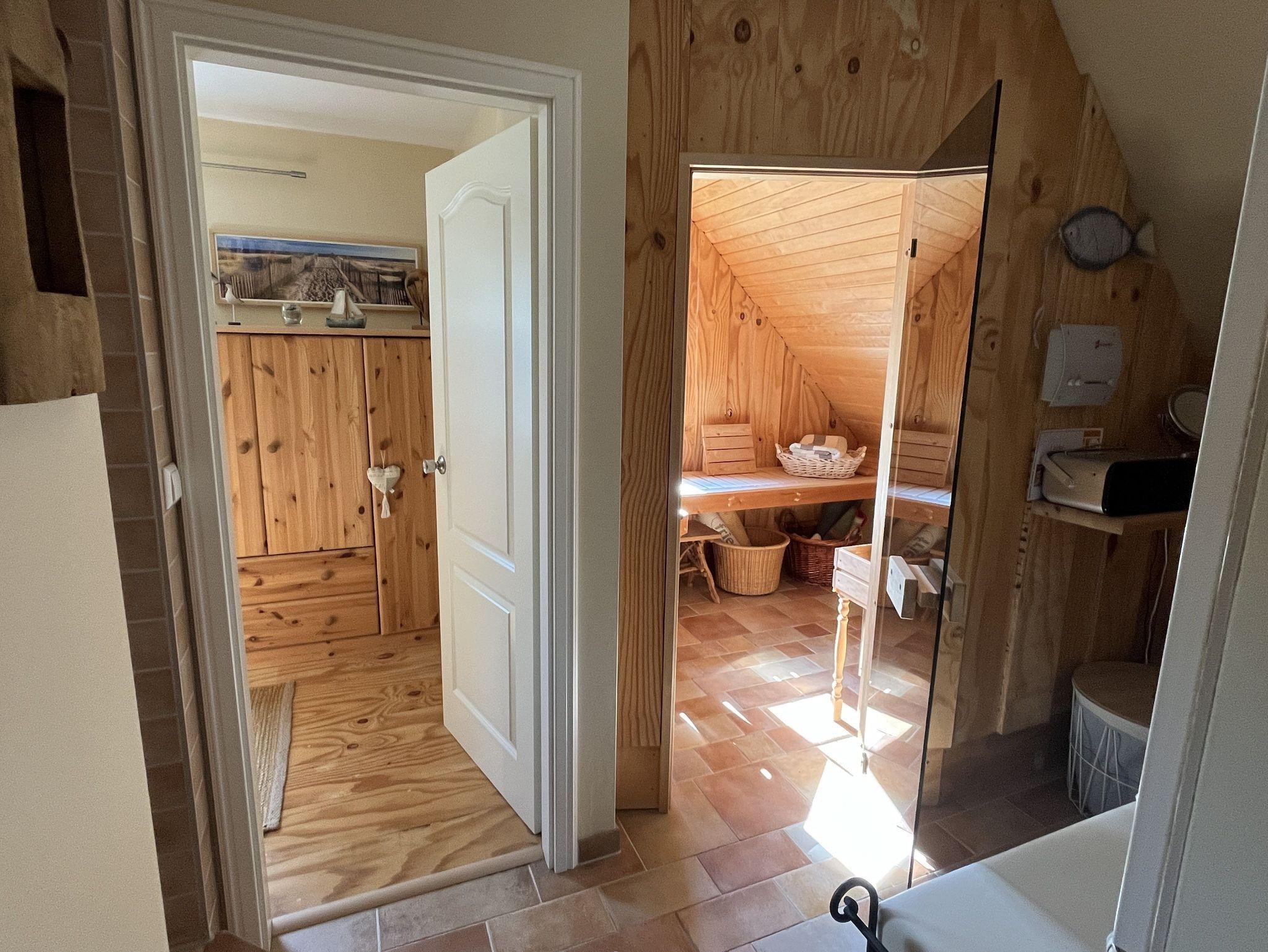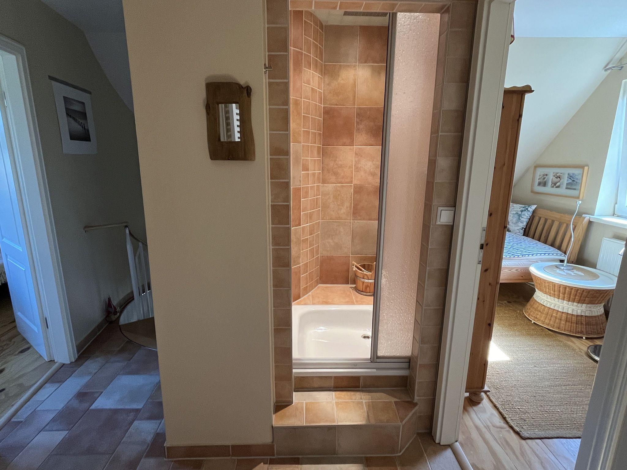 In der oberen Etage befinden sich neben der Sauna 10,00€ (inkl. separate Duschmöglichkeit) auch die 2 Schlafräume (jeweils mit Doppelbett). Und wenn das einmal nicht ausreicht, kann in einem Raum eine Aufbettung erfolgen. Von hier gelangen Sie in den Bereich des Bades und auf die Terrasse sowie in den Aufgang ins Obergeschoss des Ferienhauses. Das großzügige Bad, mit Wanne und Duschbereich, lädt auch gern zum „Wohlfühlen“ ein.