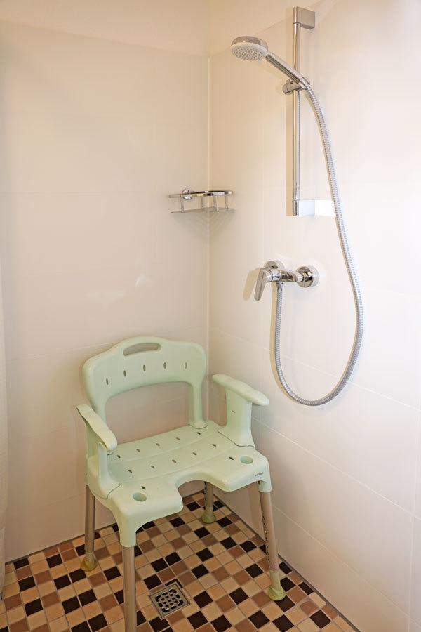 Mittelpunkt der Ferienhauses ist der 35 m² große Wohnbereich mit offener Küche und gemütlichem Essplatz. Außerdem befinden sich auf der unteren Ebene ein Schlafzimmer (1 Doppelbett , 180 x 200) und ein Duschbad. Auch Gäste, die gehbehindert oder auf einen Rollstuhl angewiesen sind, können hier gut zurecht kommen: unterfahrbares Waschbecken, erhöhtes WC, bodengleiche Dusche, ausreichende Abstände und erhöhte Betten.