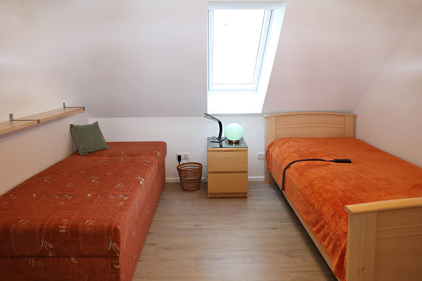 Oben gibt es drei weitere Schlafräume, ein Bad mit Dusche und einen Hometrainer.