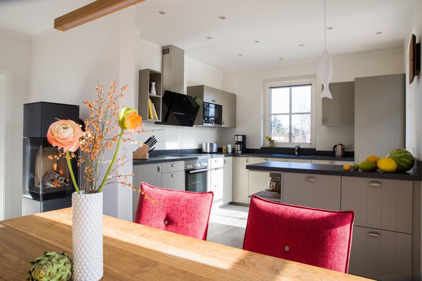 Im EG befindet sich ein ca. 36 qm großer Wohn-Essbereich mit gemütlicher Couch, Kaminofen, SAT-TV mit Sky und neben einer komplett ausgestatteten Küche ist ein Esstisch für 4 Personen vorhanden. .