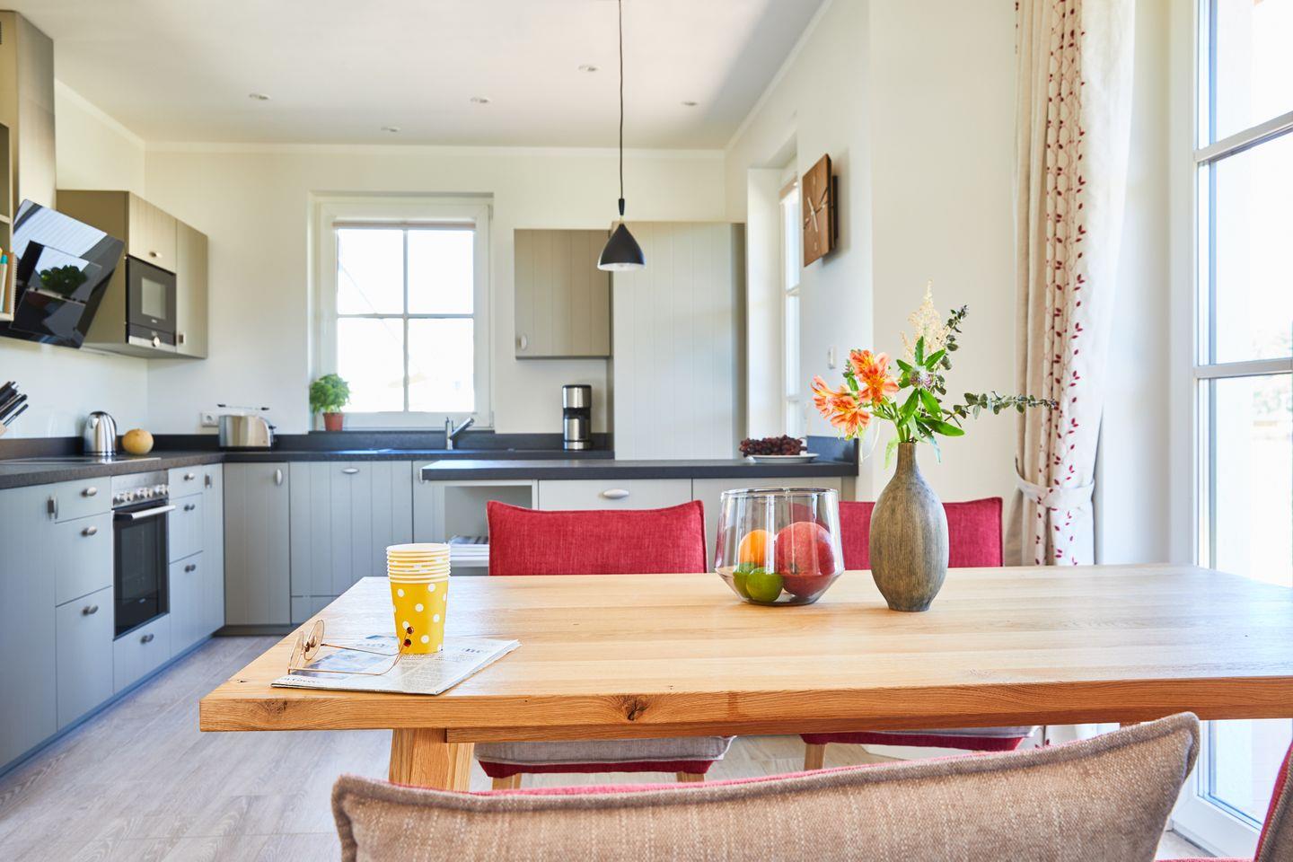 Im EG befindet sich ein ca. 36 qm großer Wohn-Essbereich mit gemütlicher Couch, Kaminofen, SAT-TV mit Sky und neben einer komplett ausgestatteten Küche ist ein Esstisch für 4 Personen vorhanden. .