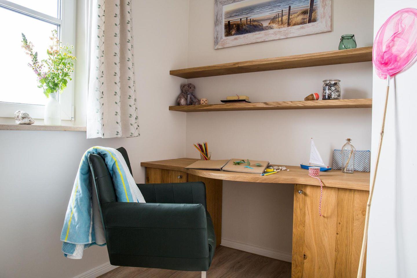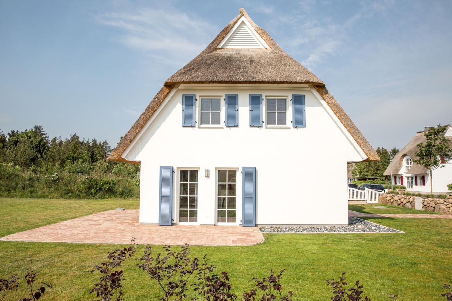 Das wunderschöne Ferienhaus mit traditionellem Reetdach, Fensterläden, ortstypischer Feldsteineinfriedung und 895 m2 großem Grundstück liegt in einer neuen Ferienhausanlage. Es bietet großzügig Platz für fünf Feriengäste (zwei Schlafzimmer mit Doppelbett, eins mit Einzelbett) und verfügt über ein Duschbad mit WC und Sauna im OG sowie ein Duschbad mit WC im EG.