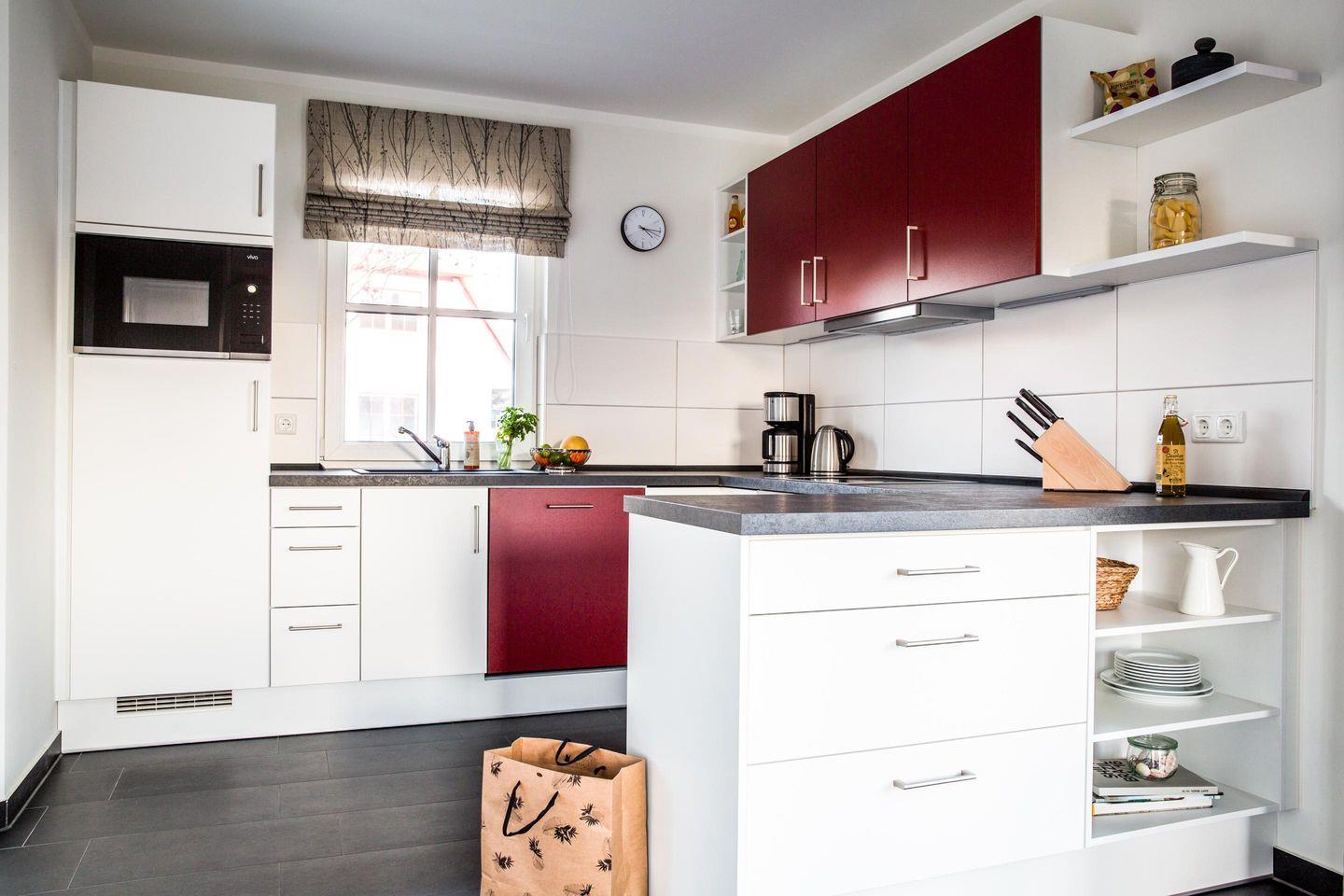 Im EG befindet sich ein ca. 30 qm großer Wohn-Essbereich mit gemütlicher Couchecke, Kaminofen, SAT-TV mit Sky und neben einer komplett ausgestatteten Küche ist ein Esstisch für 6 Personen vorhanden. Die großzügige Terrasse bietet einen herrlichen Blick auf den Teich und viel Morgen- und Abendsonne.