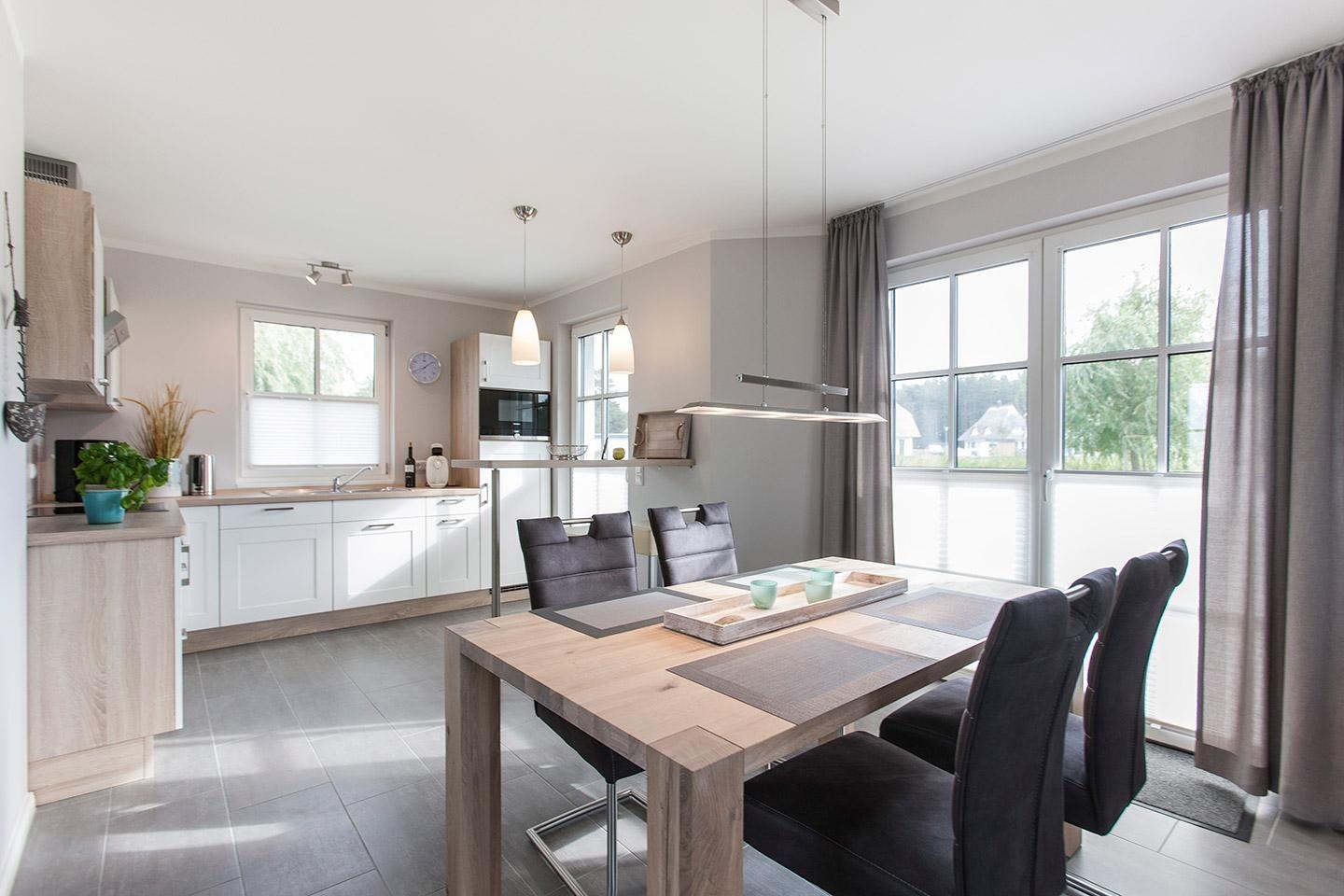Im EG befindet sich ein ca. 30 qm großer Wohn-Essbereich mit gemütlicher Couch, Kaminofen, SAT-TV mit Sky und neben einer komplett ausgestatteten Küche ist ein Esstisch für 4 Personen vorhanden. Der vorhandene Strandkorb lädt zum Verweilen ein.