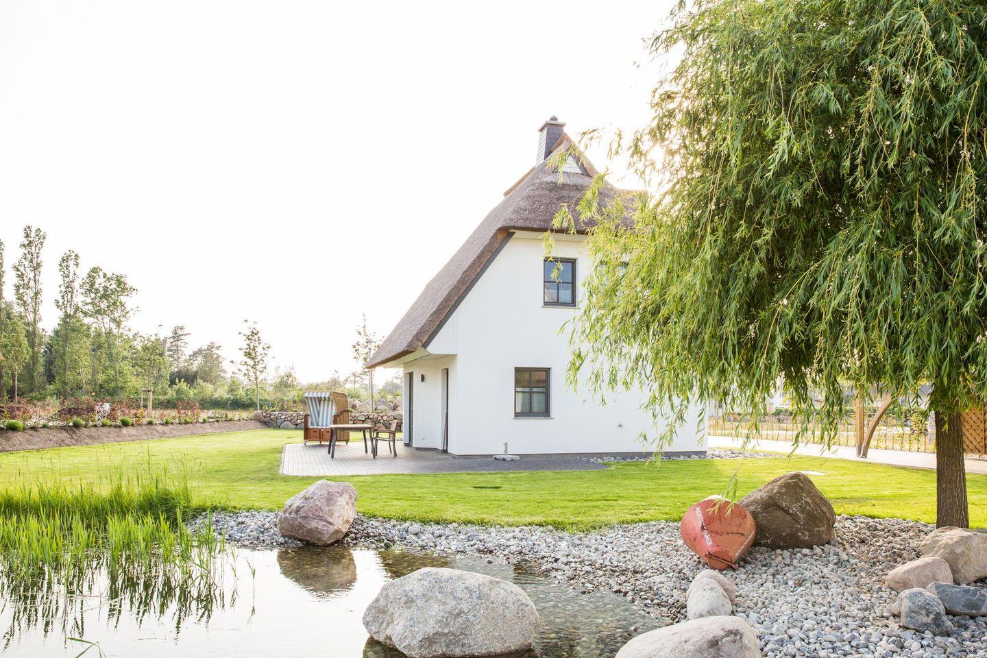 Dieses modern ausgestattete Ferienhaus mit traditionellem Reetdach, ortstypischer Feldsteineinfriedung und 618 m2 großem Grundstück am Teich liegt in einer neuen Ferienhausanlage. Es bietet viel Platz für vier Feriengäste (zwei Schlafzimmer mit Doppelbett und TV) und verfügt über einen großzügigen Wohn-Essbereich, ein einladendes Wannen-/Duschbad mit WC und Sauna im OG sowie ein Gäste-WC im EG.