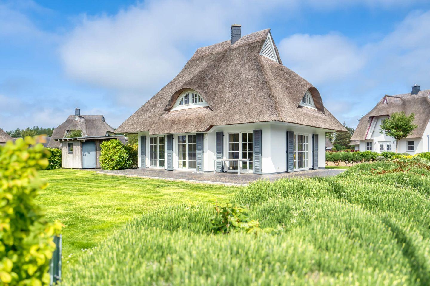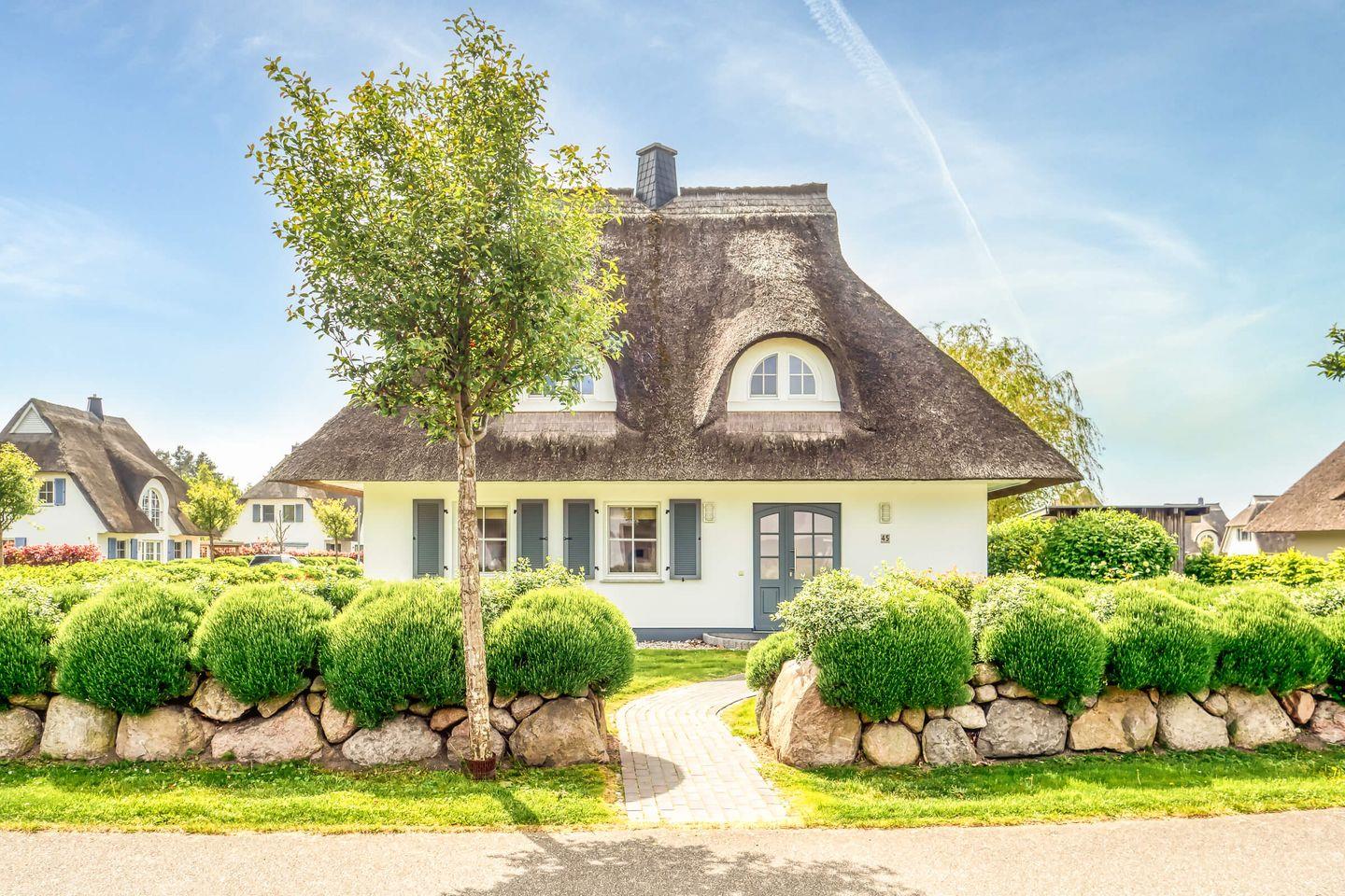 Dieses wunderschöne Ferienhaus mit traditionellem Reetdach und ortstypischer Feldsteineinfriedung auf einem 694 m2 großen Grundstück am Teich liegt in einer neuen Ferienhausanlage. Es bietet großzügig Platz für 6 Gäste (3 Schlafzimmer mit Boxspring-Doppelbett, davon 1 im EG) u. verfügt über zwei hochwertige Bäder und ein Gäste-WC, davon ein Bad mit Badewanne u. Dusche, ein Bad mit Dusche und SAUNA. Im EG befindet sich ein ca. 30 qm großer Wohn-Essbereich mit gemütlichen Sitzmöglichkeiten, Kaminofen, SAT-TV mit Sky und neben einer komplett ausgestatteten Küche ist ein Esstisch für 6 Personen vorhanden. Stellfläche für 2 PKW u. abschließbarer Fahrradschuppen auf dem Grundstück.