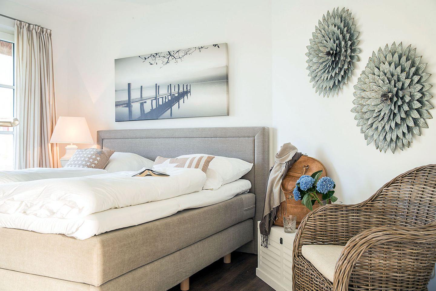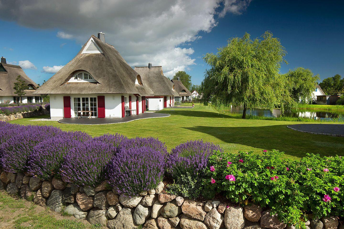 Dieses wunderschöne Ferienhaus mit traditionellem Reetdach, Fensterläden, ortstypischer Feldsteineinfriedung und 706 m2 großem Grundstück am Teich liegt in einer neuen Ferienhausanlage. Es bietet großzügig Platz für sechs Feriengäste (drei Schlafzimmer mit Doppelbett, davon eins im EG) und verfügt über zwei hochwertige Bäder und ein Gäste-WC, davon ein Bad mit Badewanne und Dusche, ein Bad mit Dusche und Sauna.