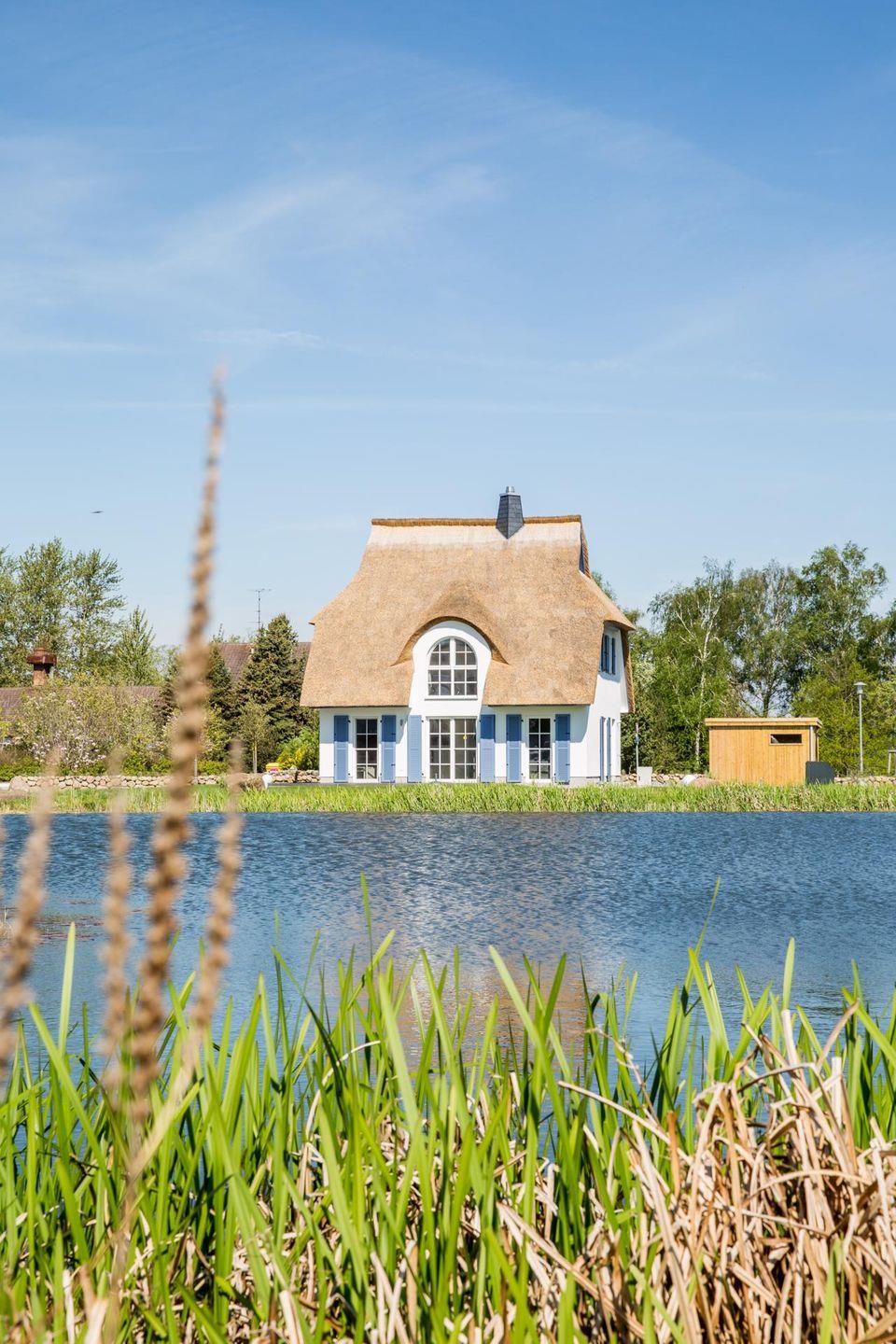 Das wunderschöne Ferienhaus mit traditionellem Reetdach, Fensterläden, ortstypischer Feldsteineinfriedung und 763 m2 großem Grundstück am Teich liegt in einer neuen Ferienhausanlage. Es bietet großzügig Platz für fünf Feriengäste (zwei Schlafzimmer mit Doppelbett, eins mit Einzelbett) und verfügt über ein Duschbad mit WC und Sauna im OG sowie ein Gäste-WC im EG.