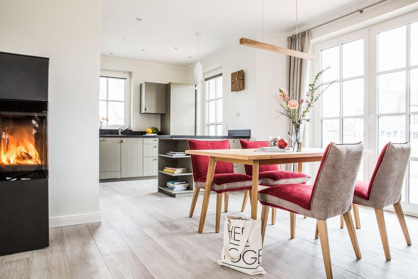 Im EG befindet sich ein ca. 36 qm großer Wohn-Essbereich mit gemütlicher Couch, Kaminofen, SAT-TV mit Sky und neben einer komplett ausgestatteten Küche mit Kaffeevollautomat ist ein Esstisch für 4 Personen vorhanden.