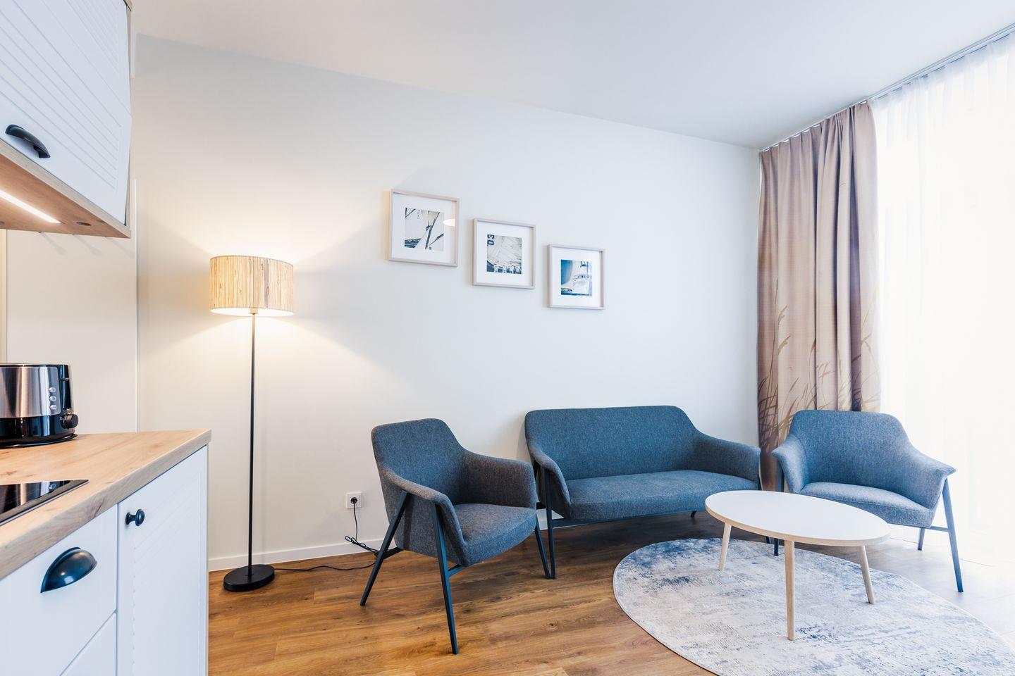 Das gemütliche Appartement bietet auf 34 qm viel Platz für bis zu 2 Personen. Der komfortable Wohnbereich besitzt ein bequemes Sofa mit Kuscheldecke und sorgt mit einem Flat Screen-TV für Entertainment.