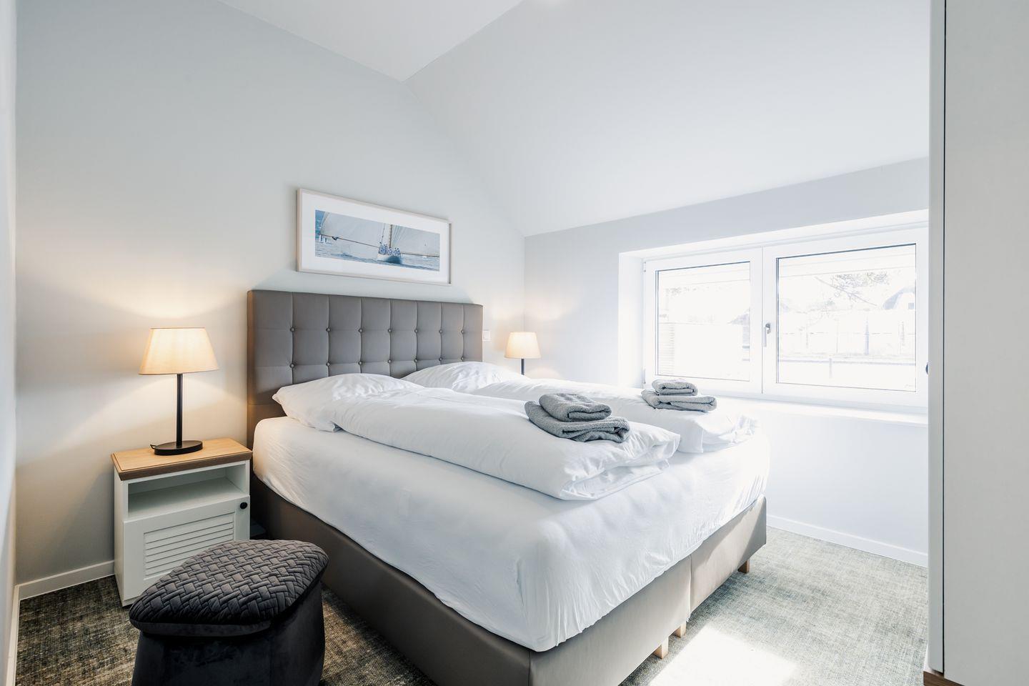 Das Schlafzimmer bietet ein modernes Doppelbett (1,60m x 2,00m), auf welchem Sie Erholung und Entspannung finden. Ein Kinderbett sowie ein Hochstuhl können auf Anfrage hinzugebucht werden.