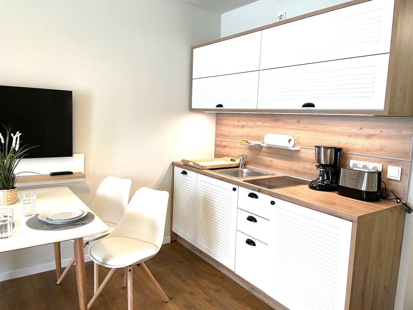 Die offene Pantryküche mit anliegendem Essbereich bieten Ihnen einen Geschirrspüler, Kühlschrank mit Gefrierfach, Kaffeemaschine, 2-Platten-Ceranfeld und Wasserkocher.