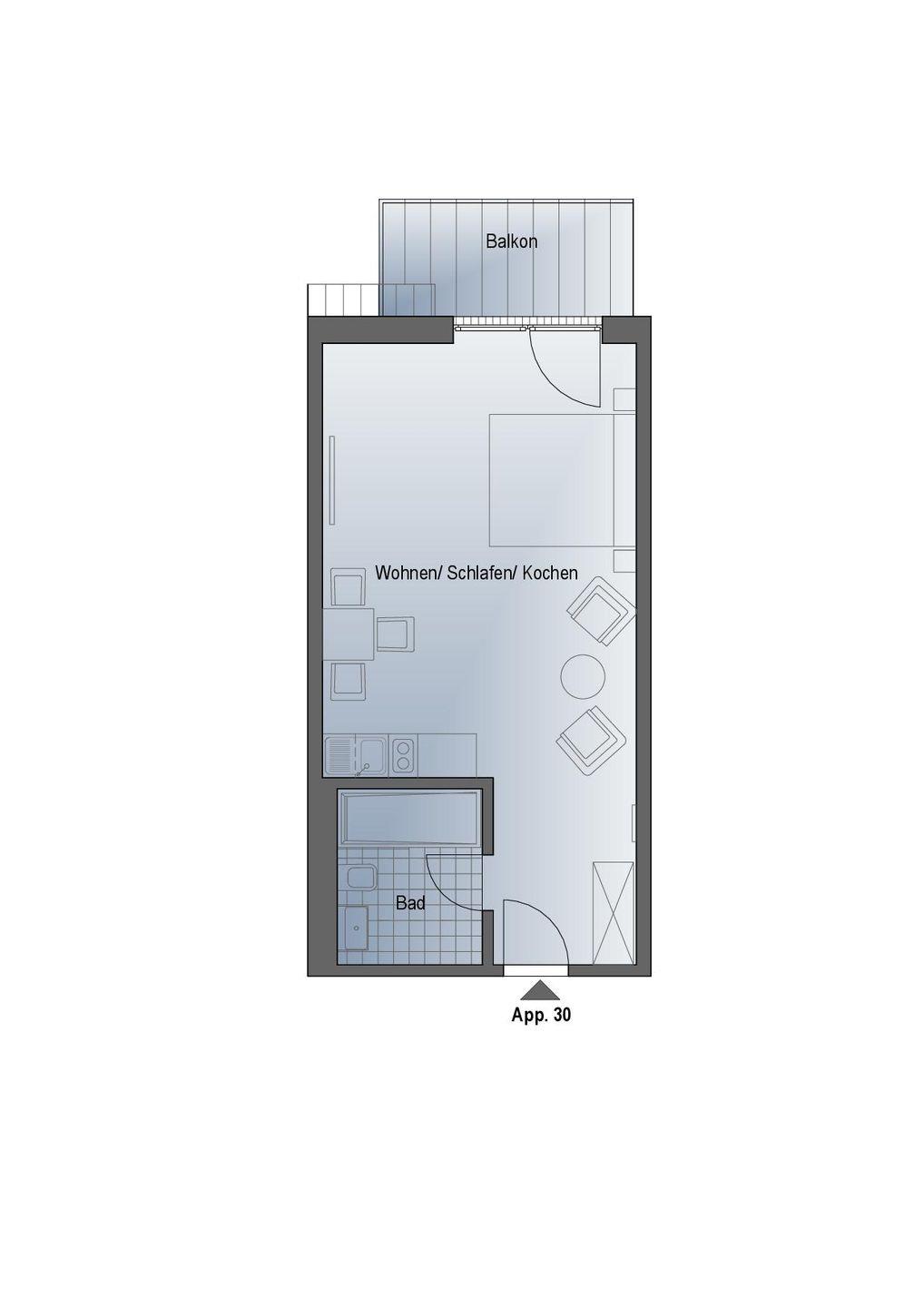 Das komfortable Appartement bietet auf 38 qm Platz für bis zu 2 Personen. Der gemütliche Wohn- und Schlafbereich besitzt ein modernes Doppelbett (1,80m x 2,00m), auf welchem Sie Ihre Erholung finden werden. Zu Ihrem Entertainment dient ein moderner Flatscreen-TV. Ein Kinderbett sowie ein Hochstuhl können auf Anfrage hinzugebucht werden.